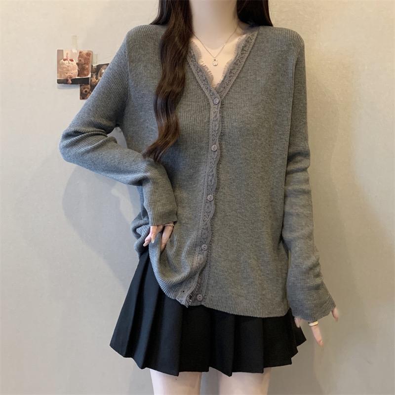 胖mm显瘦打底衫 冬季 遮肚子蕾丝拼接针织开衫 女装 上衣1014c 大码