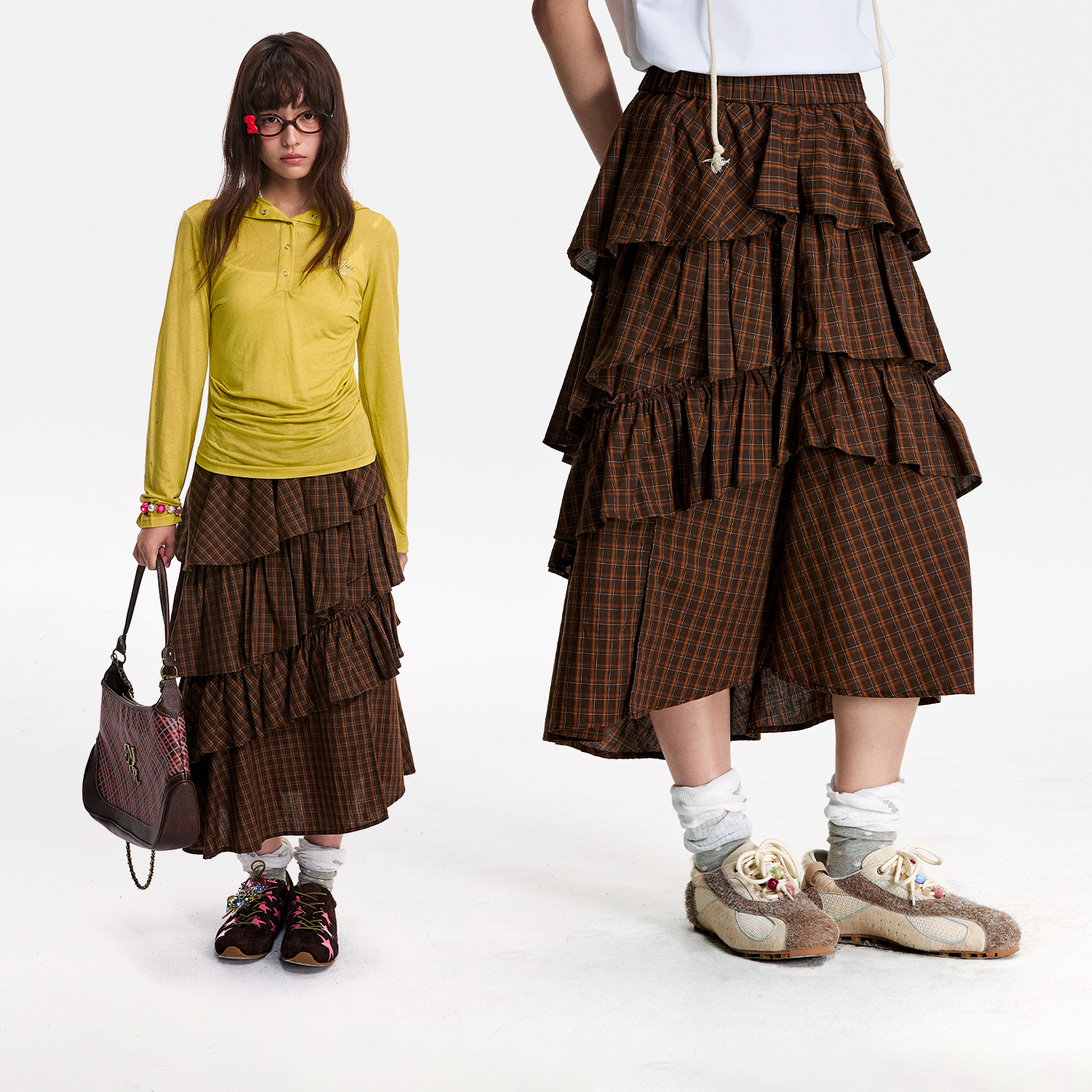 TeenieWeenie小熊女半身裙绵羊毛格纹刺绣百褶裙 赵露思同款