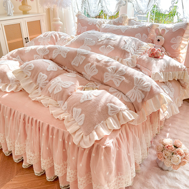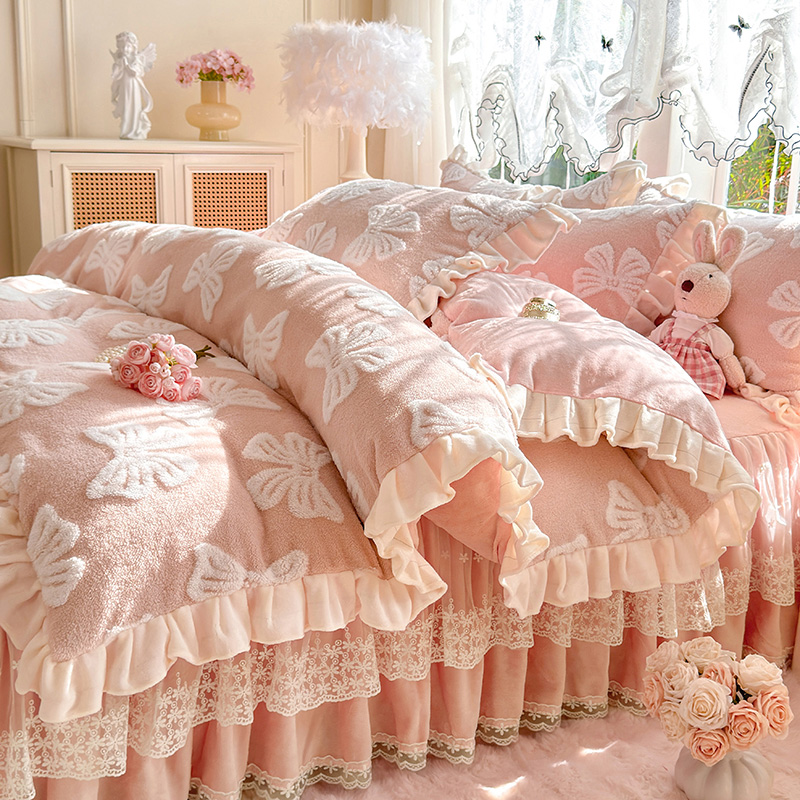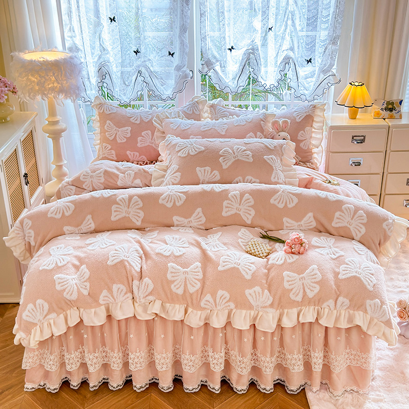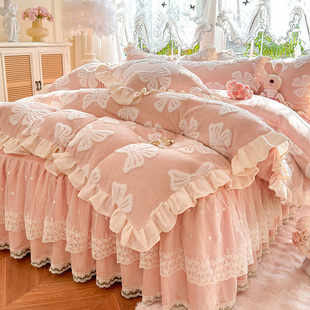 冬季 雕花珊瑚绒双面绒被套床单 加厚花边牛奶绒四件套公主风床裙款