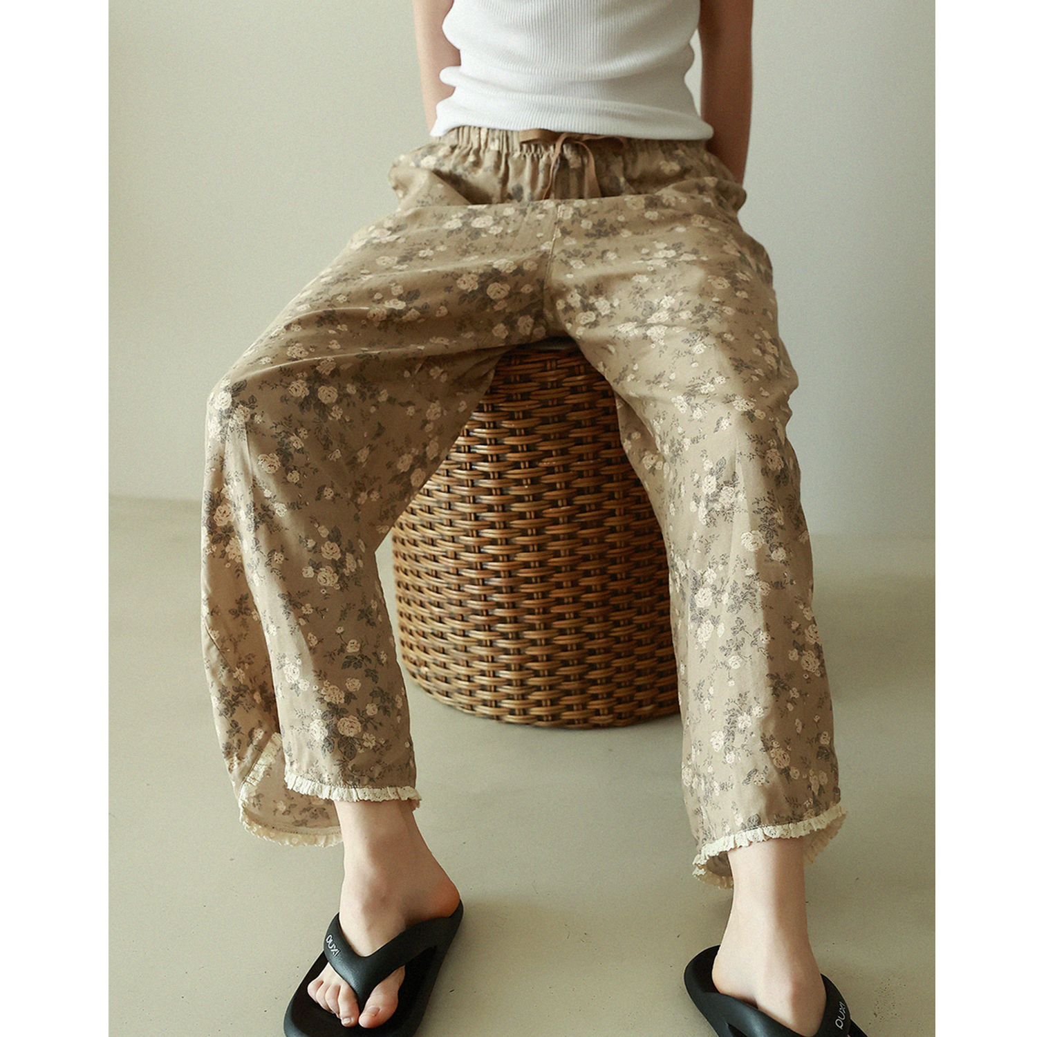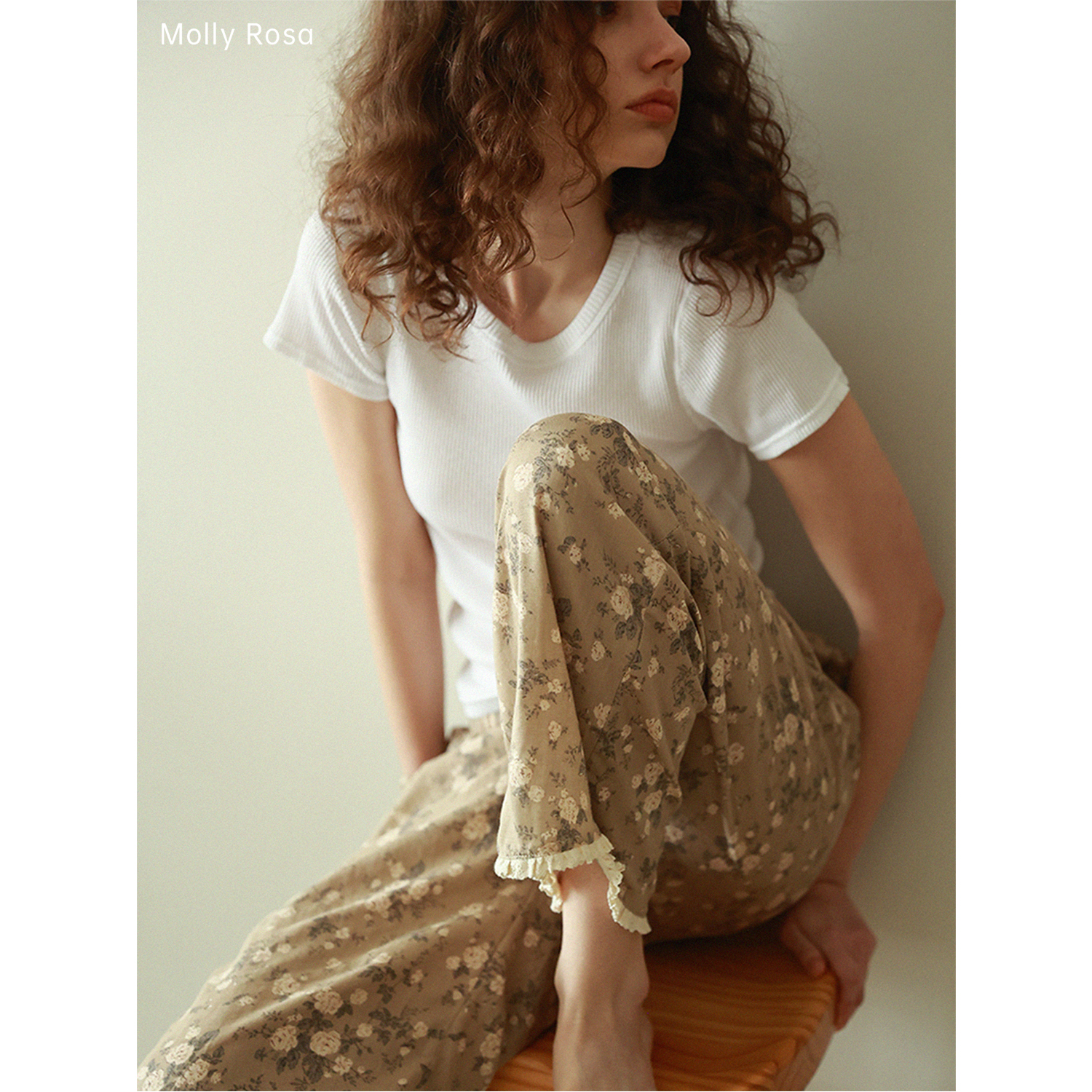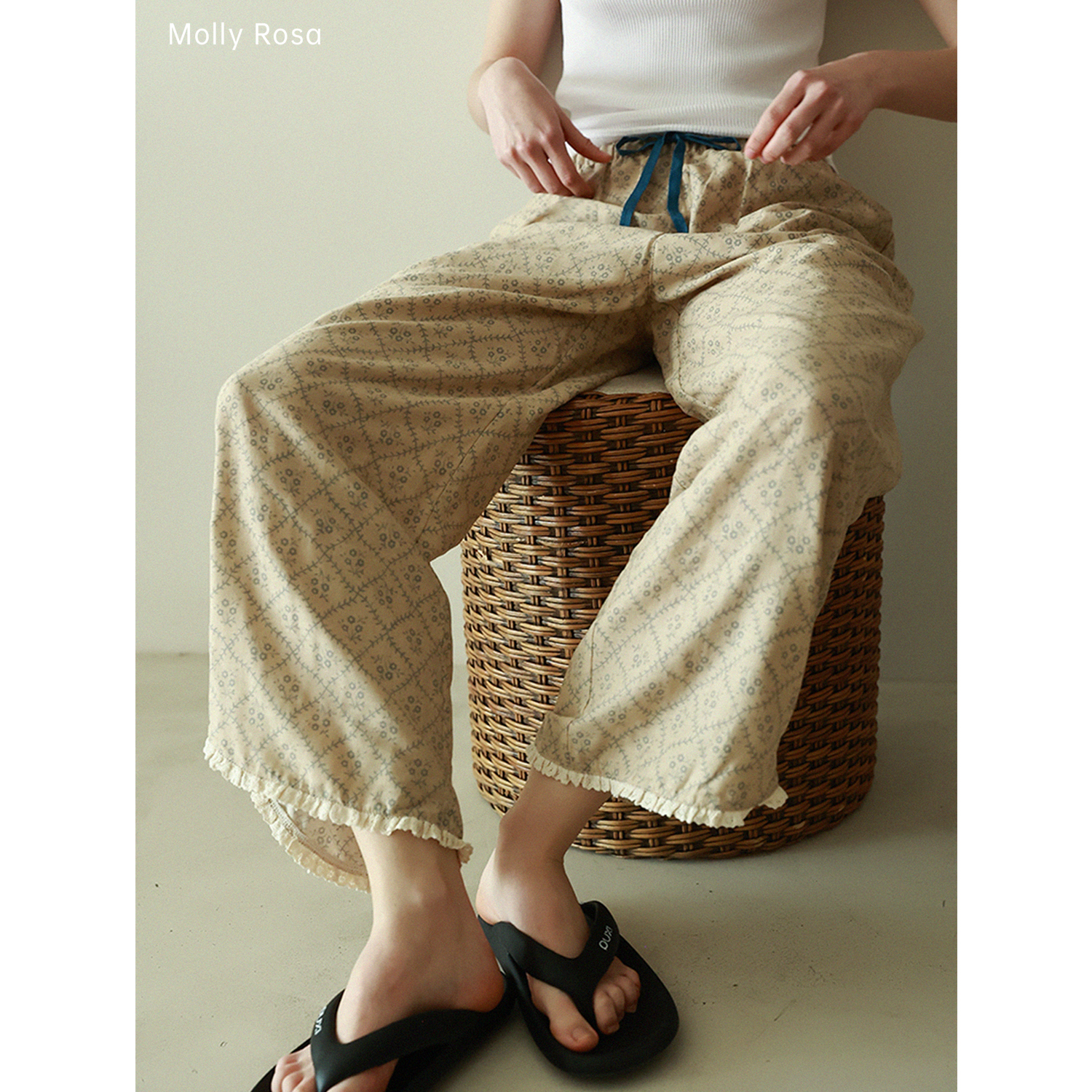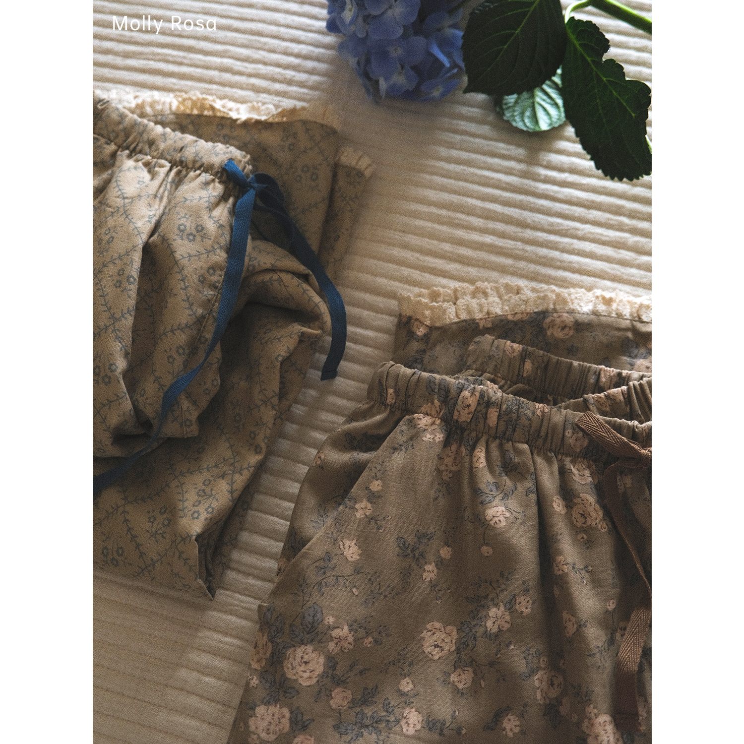 MollyRosa百搭遛弯裤 田园风纯棉双层纱卡其蓝&浅咖蔷薇花休闲长裤