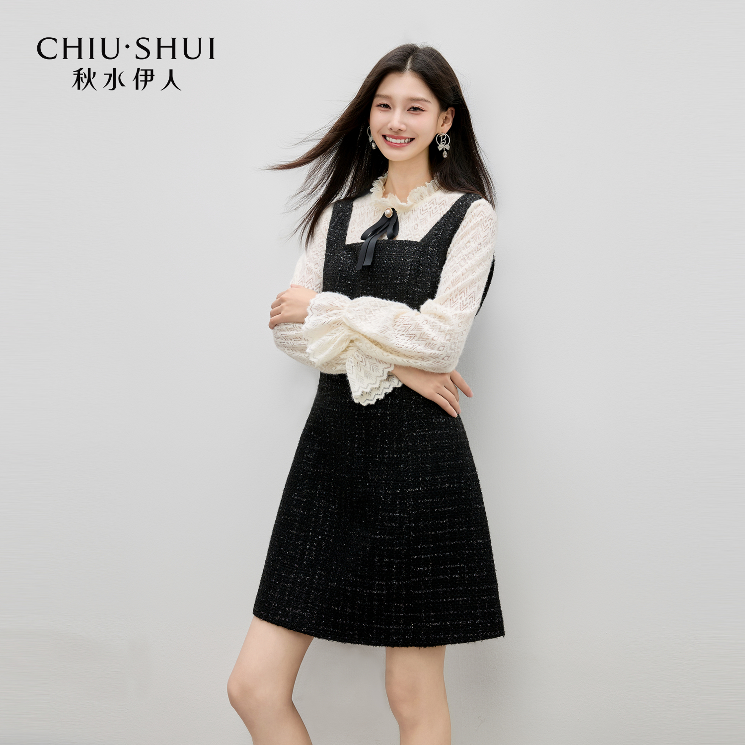 气质两件套蕾丝内搭背心裙 2025秋新品 秋水伊人黑色小香风时尚 套装