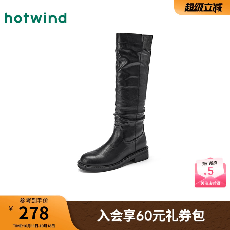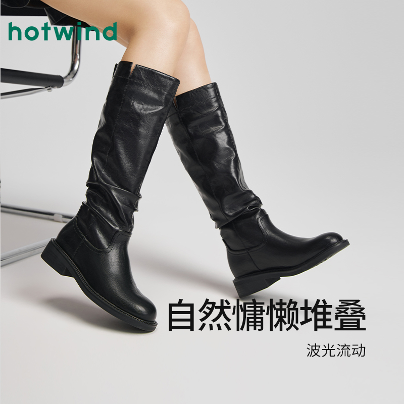 靴子女鞋 复古褶皱骑士靴堆堆时装 新款 热风黑色长筒靴女2025年冬季