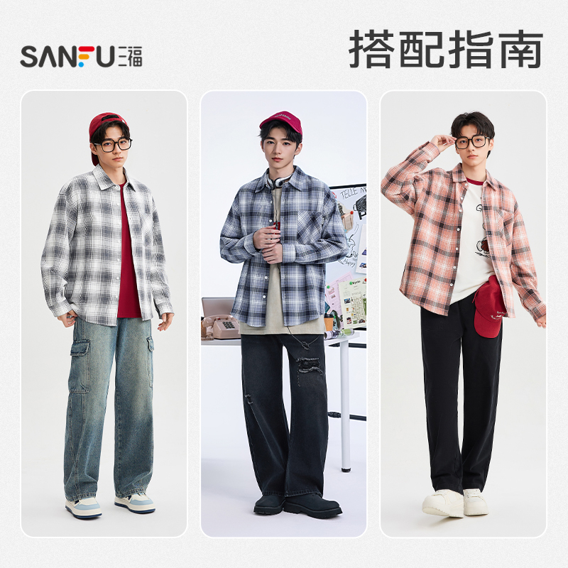 潮牌港风衬衣宽松百搭男士 班尼路SK格子衬衫 新款 秋季 外套MS 男长袖