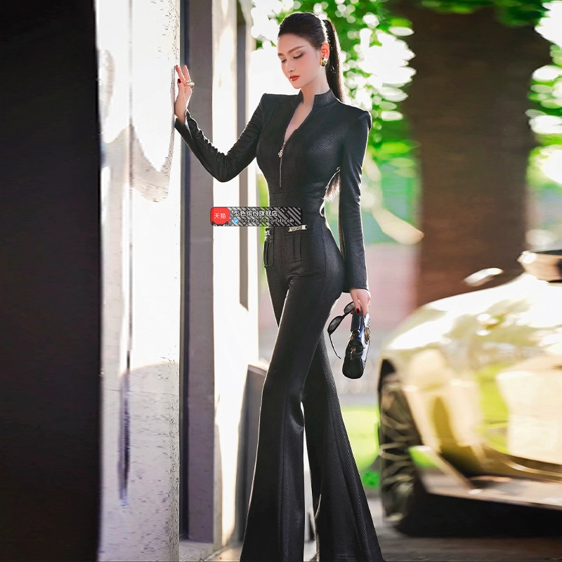 微喇叭设计感连身长裤 早秋欧美时尚 新款 收腰气质连体裤 修身