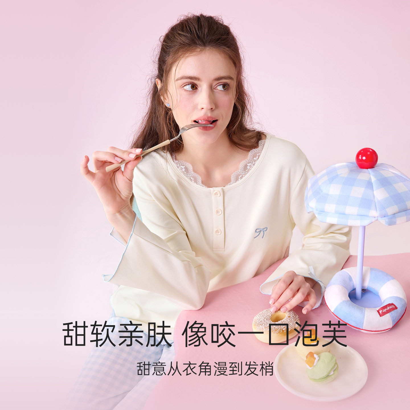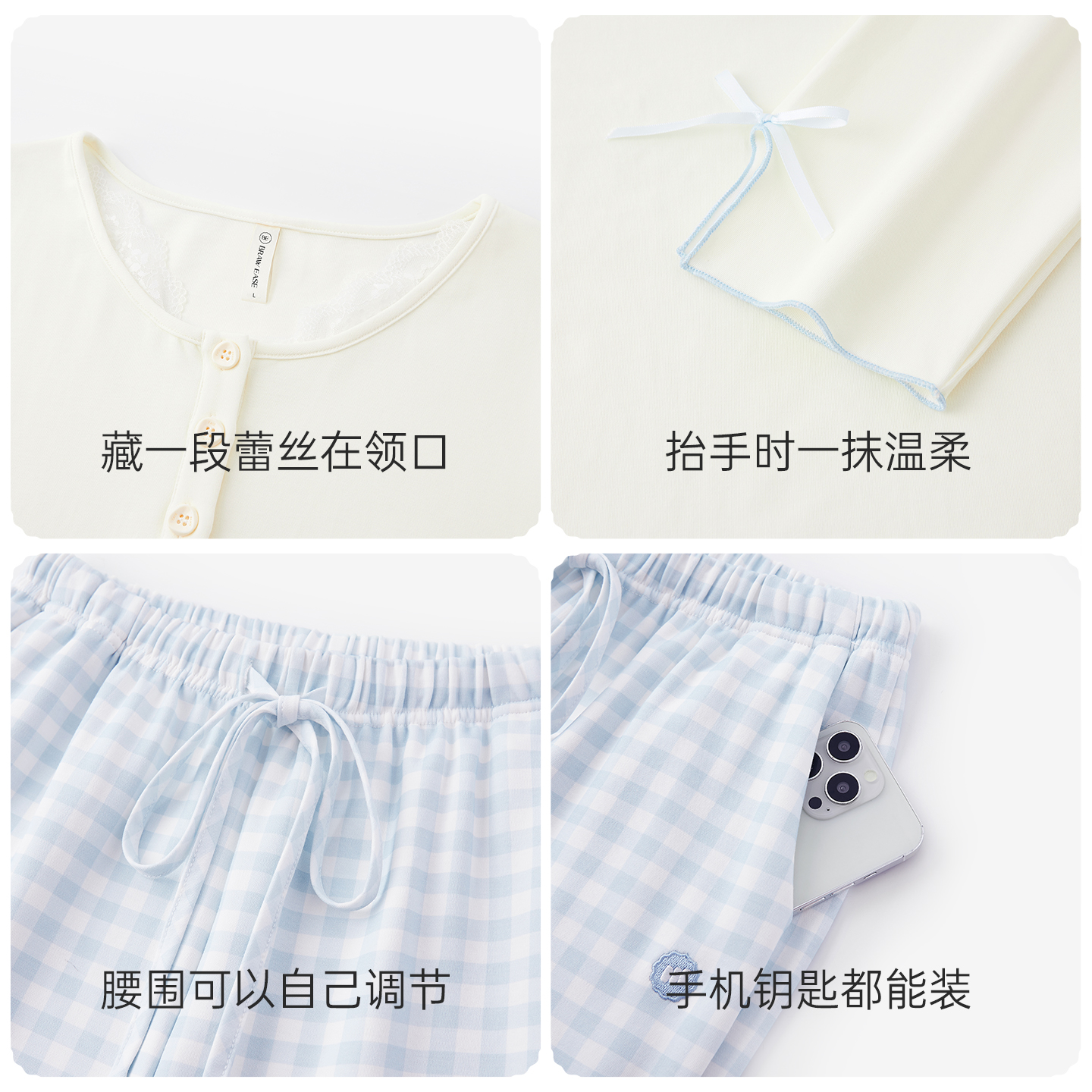 格子女士长袖 纯棉睡衣女款 秋天家居服套装 2025新款 棉蕾丝秋冬 秋季