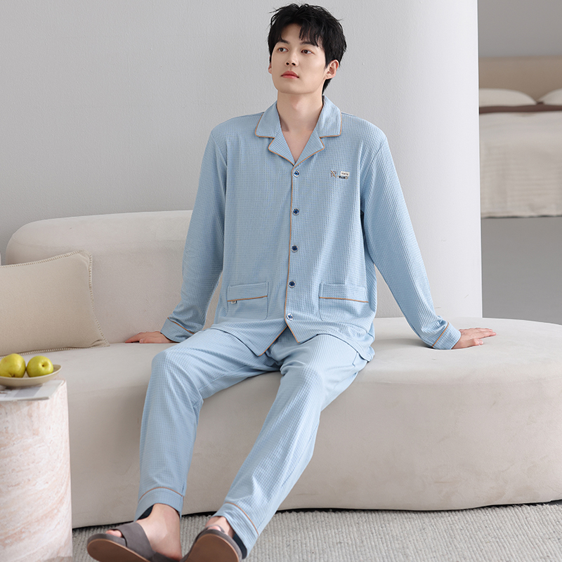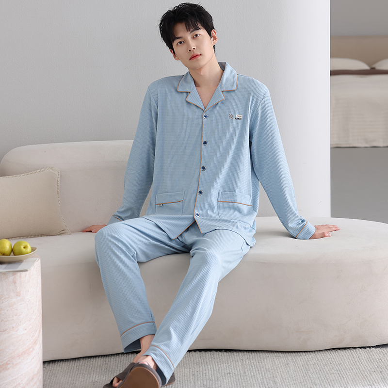秋冬家居服套装 圆人纯棉睡衣男春秋新款 宽松休闲纯色大码 长袖 开衫