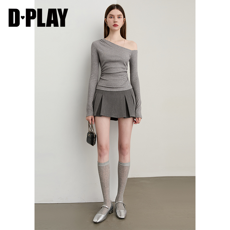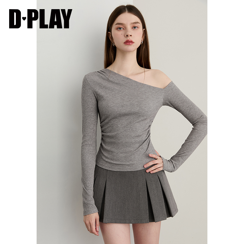 弹力修身 灰色长袖 露肩辣妹风t恤斜肩上衣女 新款 DPLAY2025年秋季