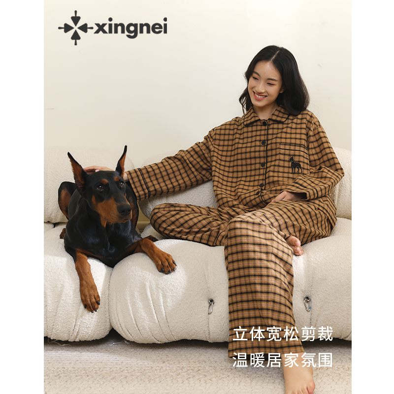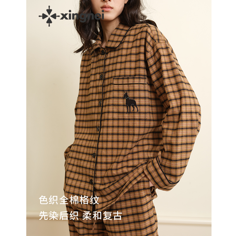 高级感棕色家居服 2025新款 形内睡衣女纯棉格子条纹情侣套装 春秋装