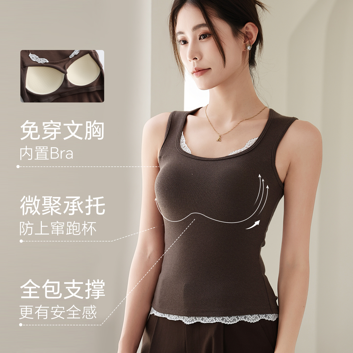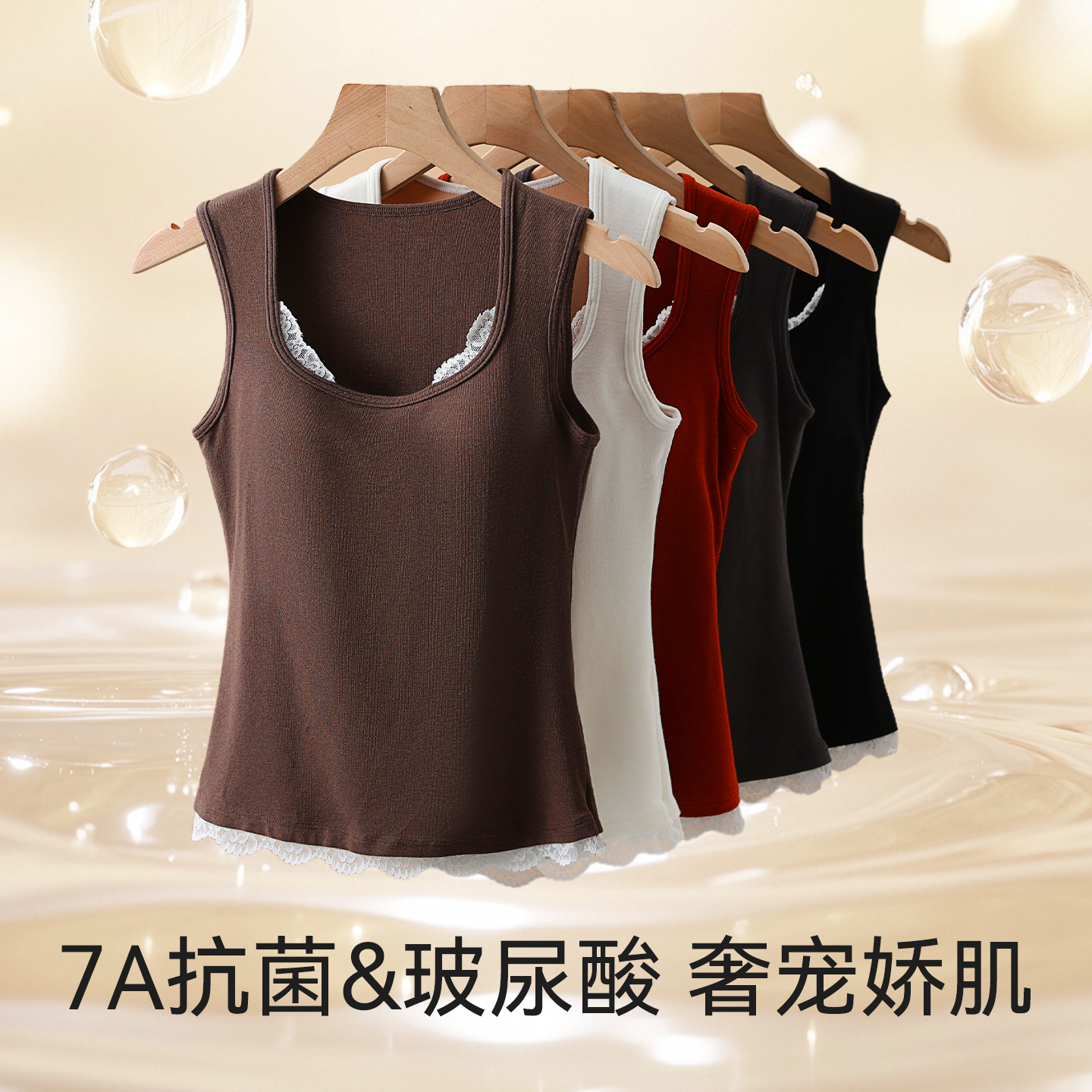 蕾丝加厚加绒吊带背心 打底无痕修身 保暖内衣女士带胸垫秋冬季 新款