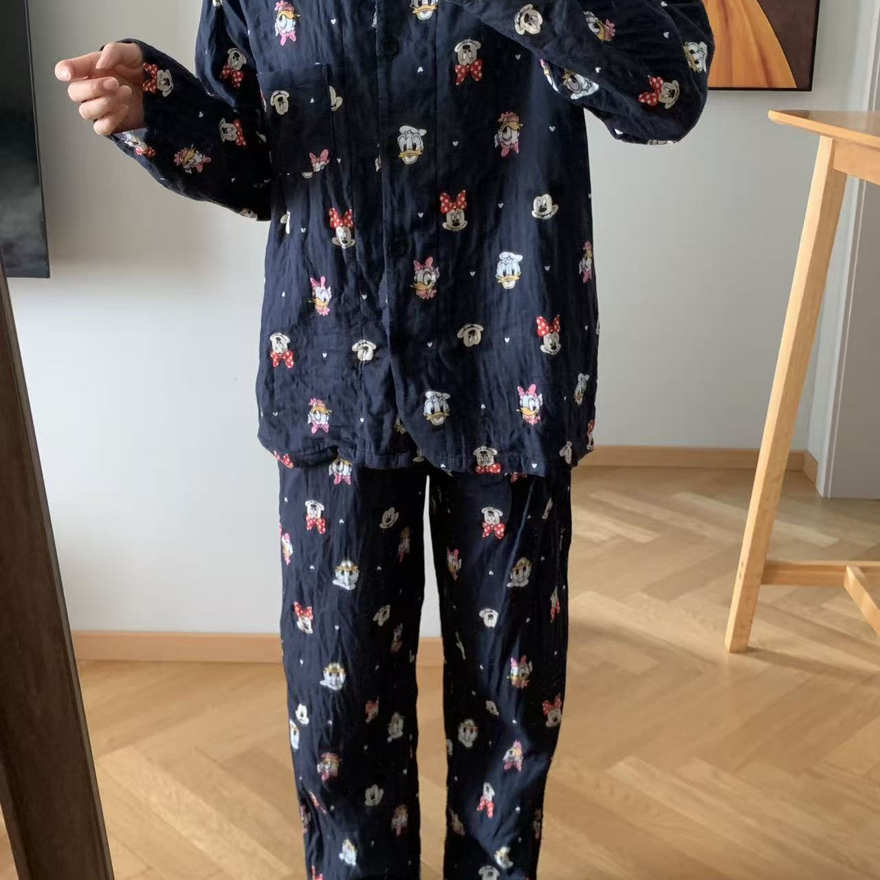长裤 长袖 黑底米奇全棉双层纱翻领睡衣卡通印花家居服套装 上新