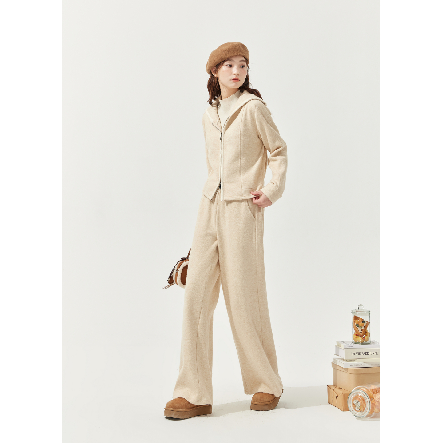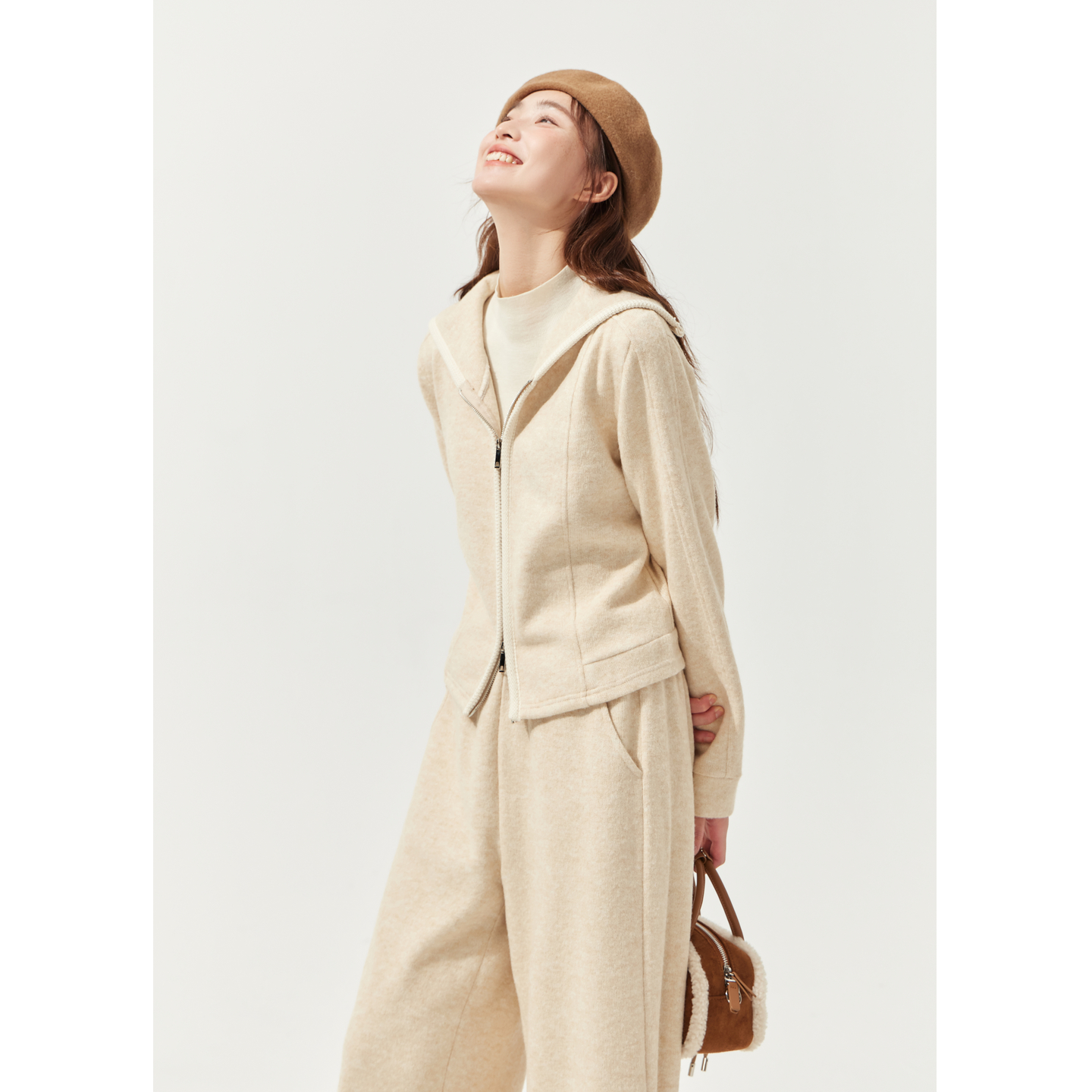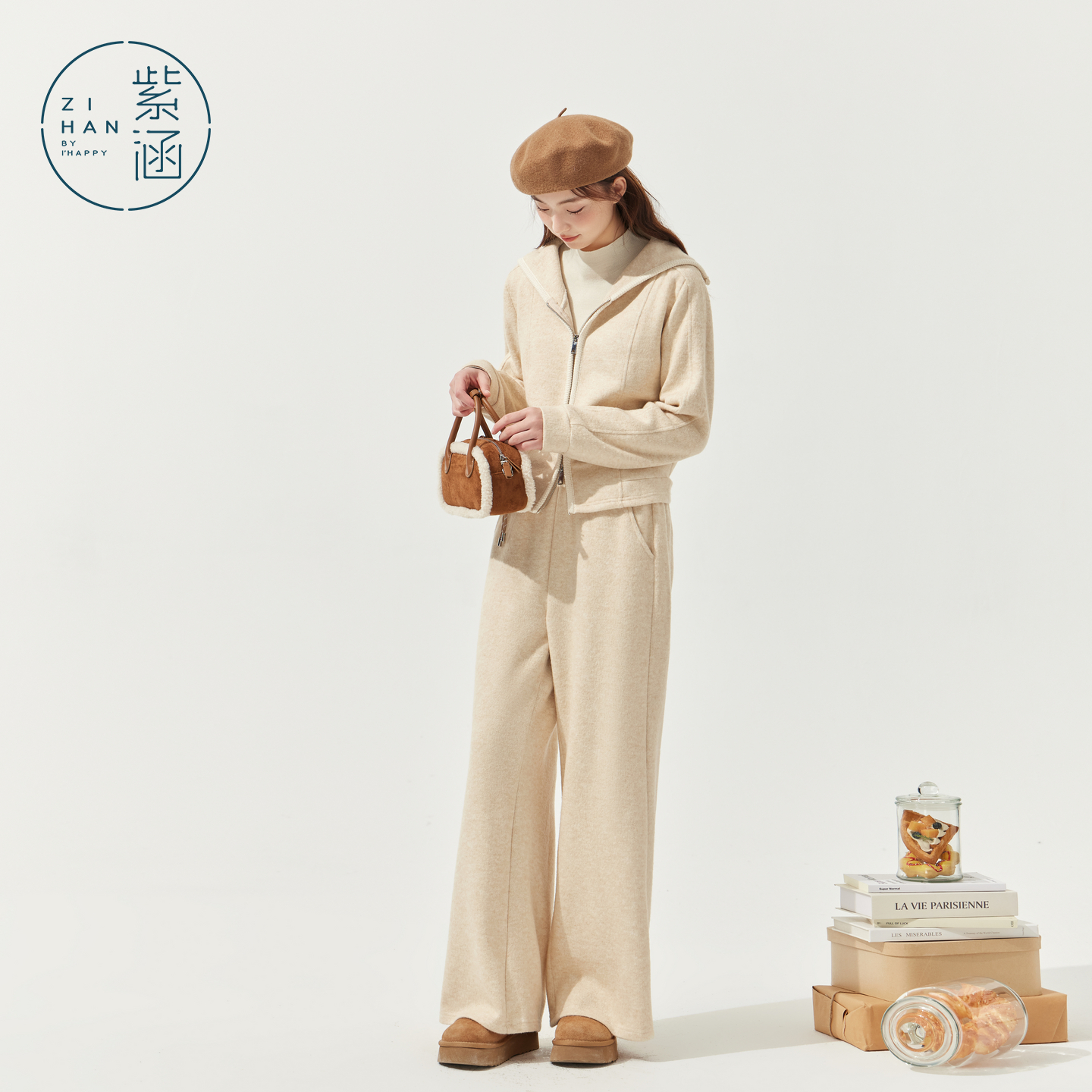 新款 紫涵短款 女2025冬季 上下两件套装 翻领拉链针织外套高腰直筒裤