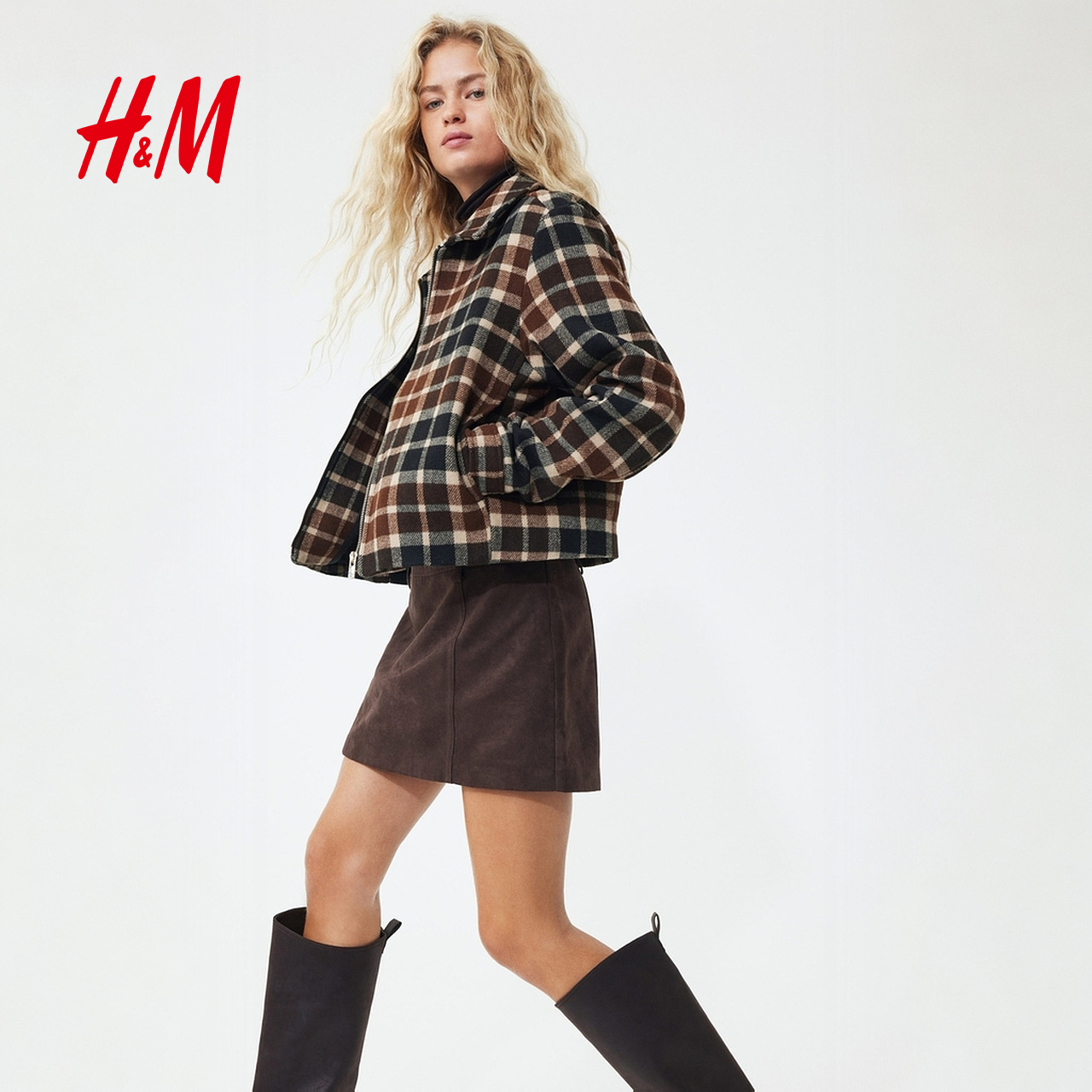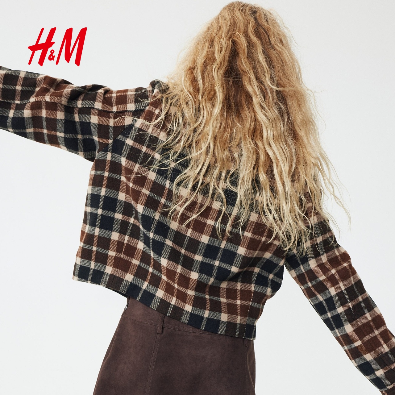 式 HM女装 翻折领英伦风衬衫 新款 格纹夹克1298605 短外套2025冬季