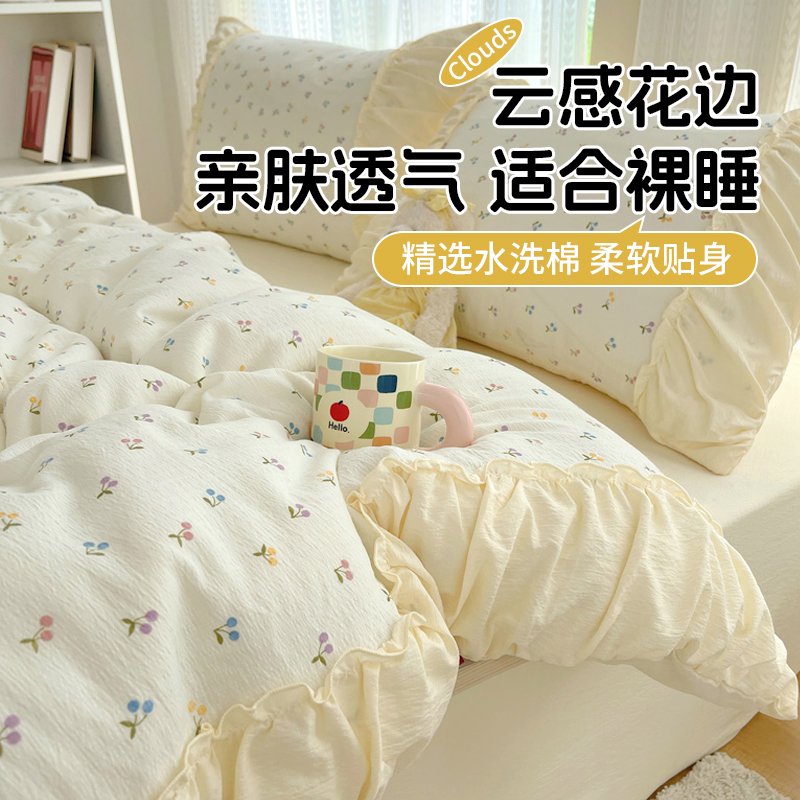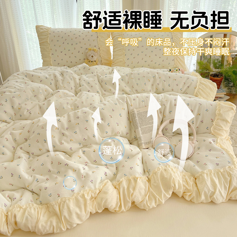 双层纱四件套床上用品A类纯非棉全棉法式 花边床单被套三件套学生4