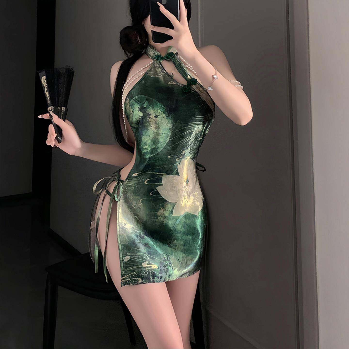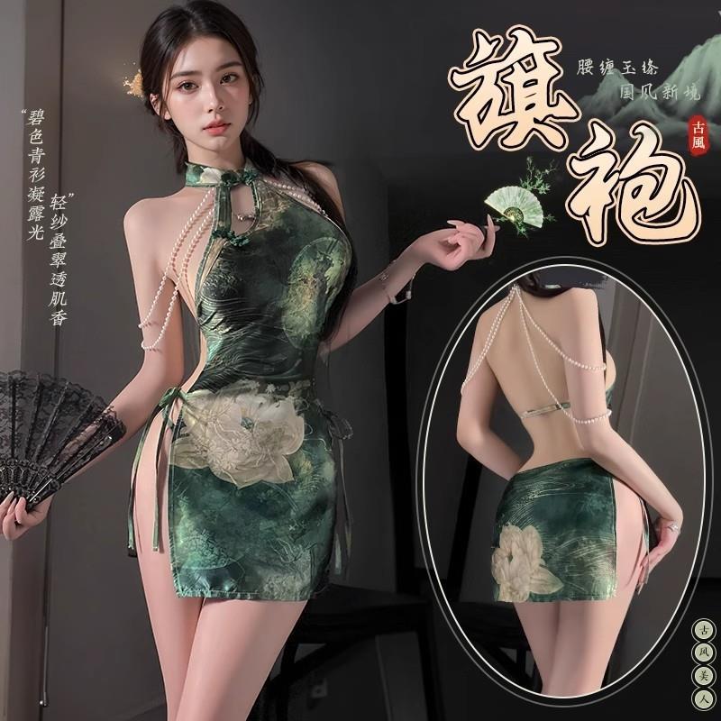 新中式 性感情趣内衣冰丝开叉旗袍珍珠露背大尺度诱惑清荷国风战袍