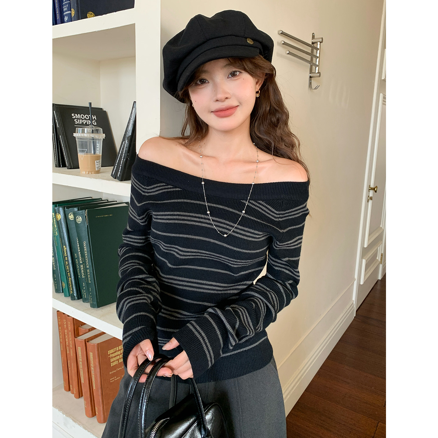 尔给秋冬韩系气质条纹绵羊毛针织女2025新款 一字肩毛衣 上衣修身
