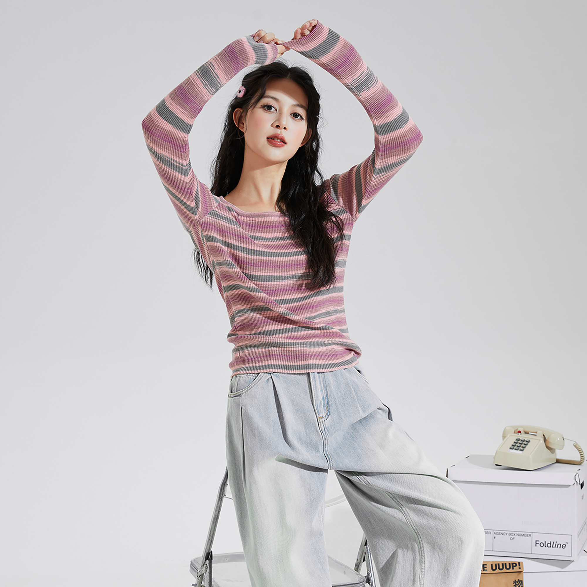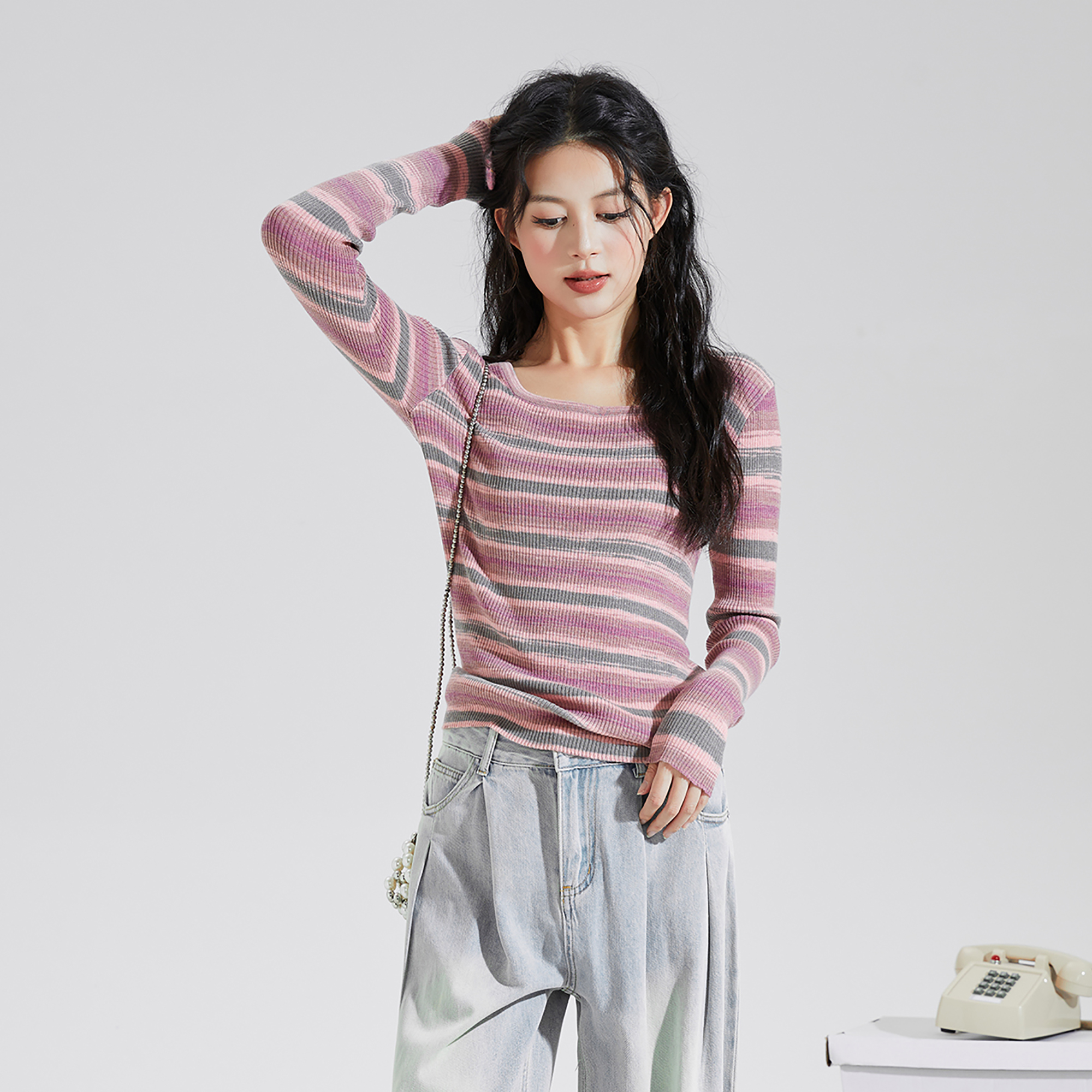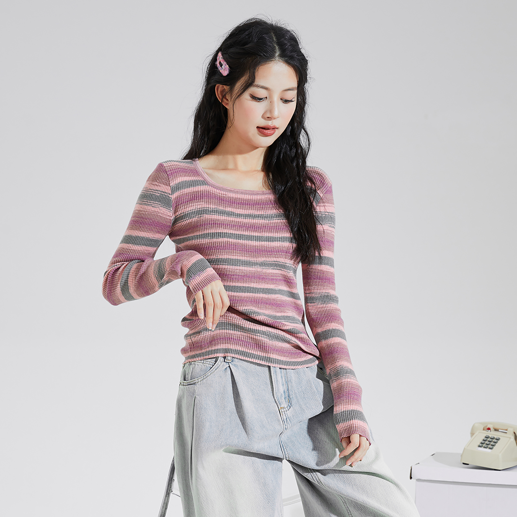 U型领显瘦好看针织衫 女秋冬新款 T恤tu 内搭打底衫 唐狮圆领条纹长袖