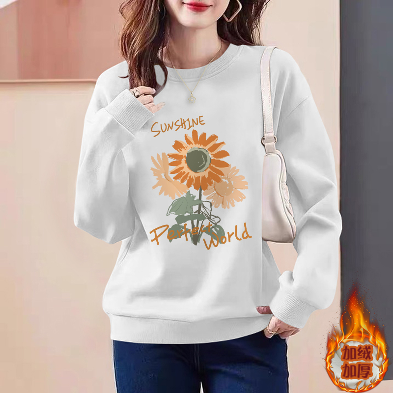 向日葵白色圆领套头卫衣女2025新款 欧货独特漂亮上衣加绒外套 秋季