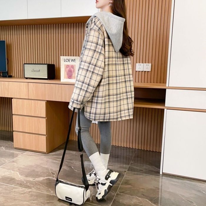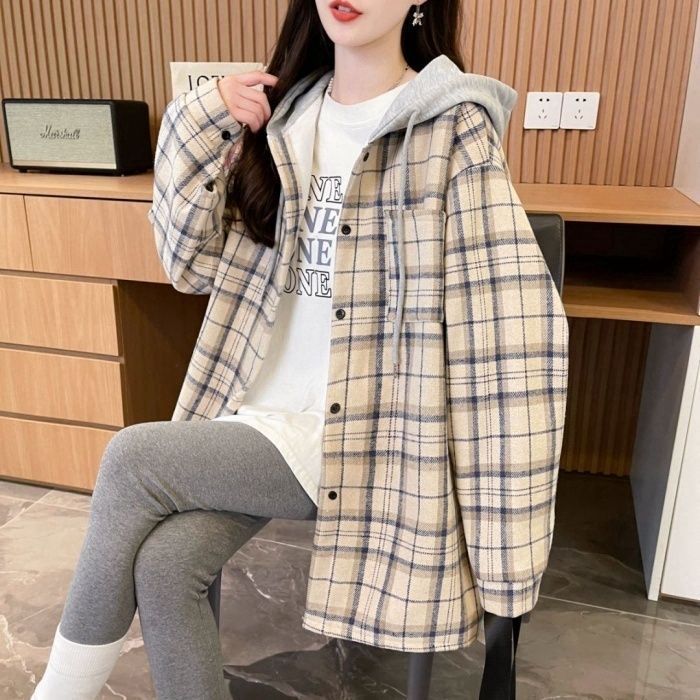 胖mm时尚 新款 洋气超好看上衣 宽松高级感格子连帽外套女秋冬装 大码