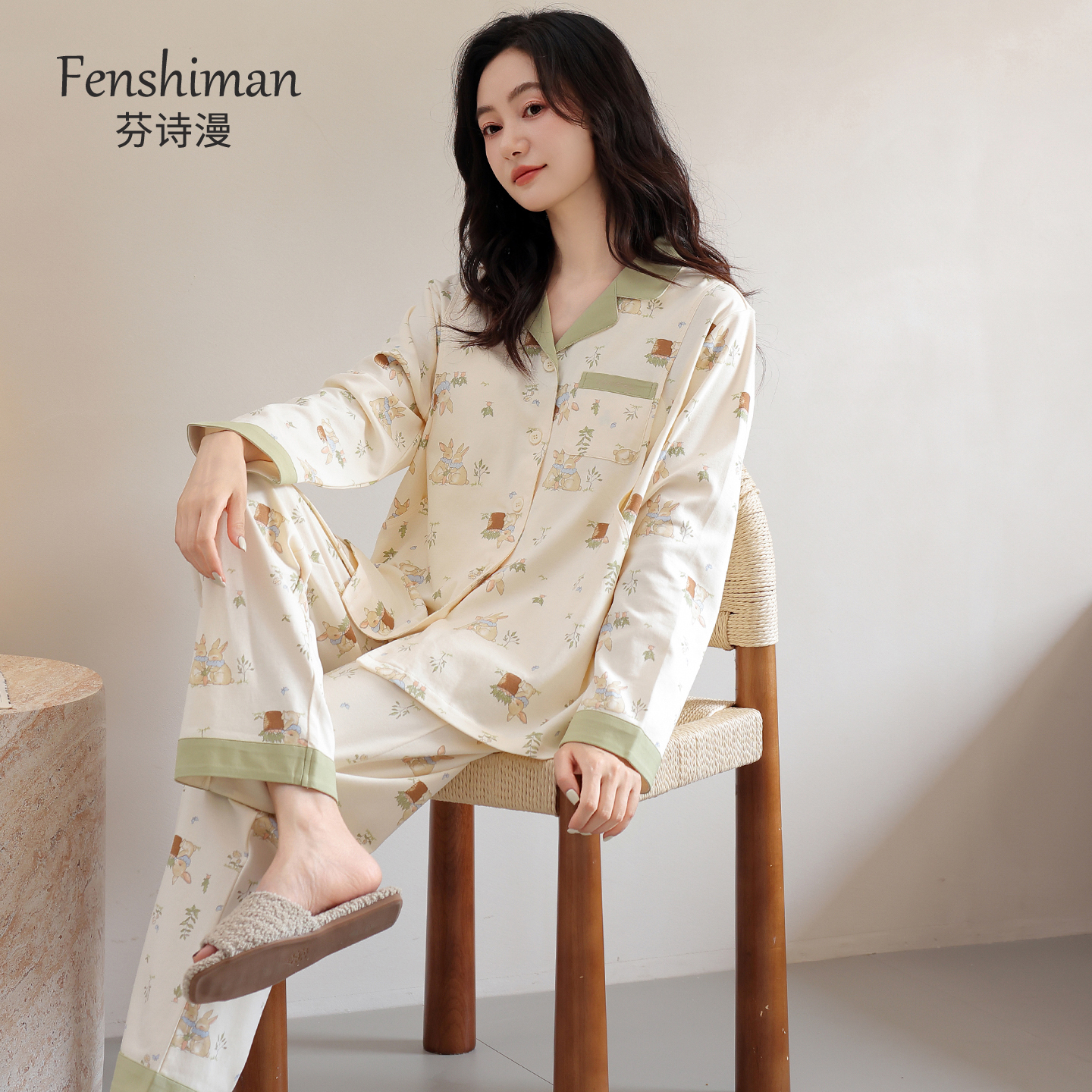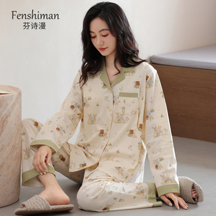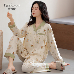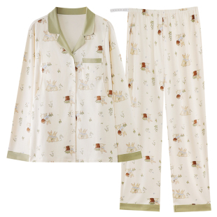 套装 翻领高级可外穿家居服大码 长袖 猫人纯棉睡衣女带胸垫秋冬新款