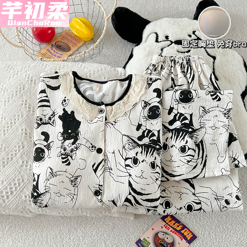 云朵棉甜美卡通秋天蕾丝家居服薄 2025新款 睡衣女春秋季 带胸垫长袖