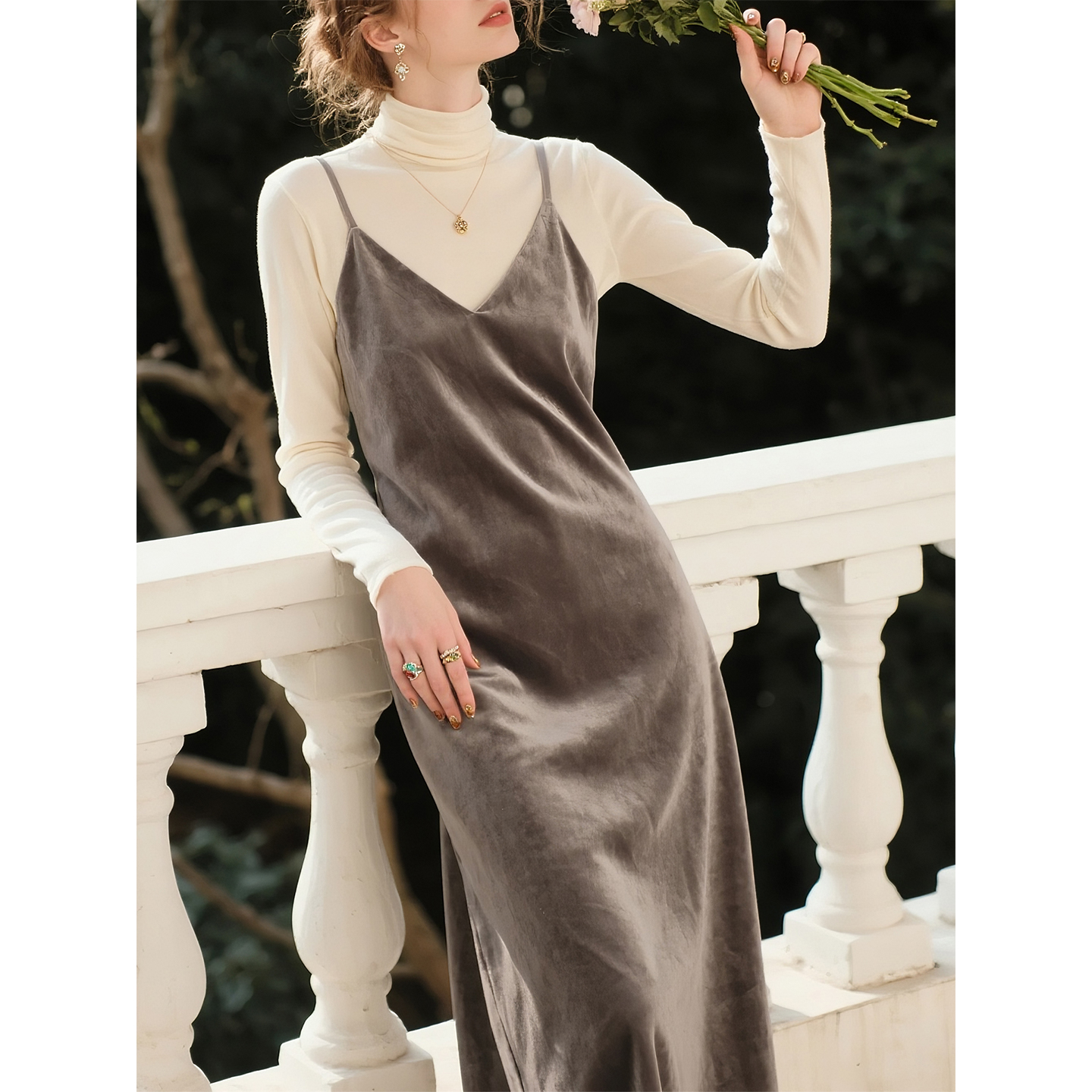 慵懒感气质叠穿连衣裙 法式 浅灰色丝绒吊带连衣裙女2025年秋季 新款