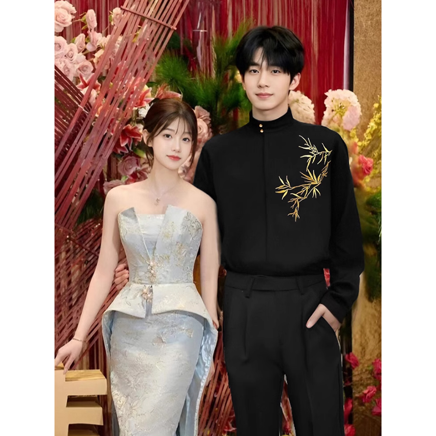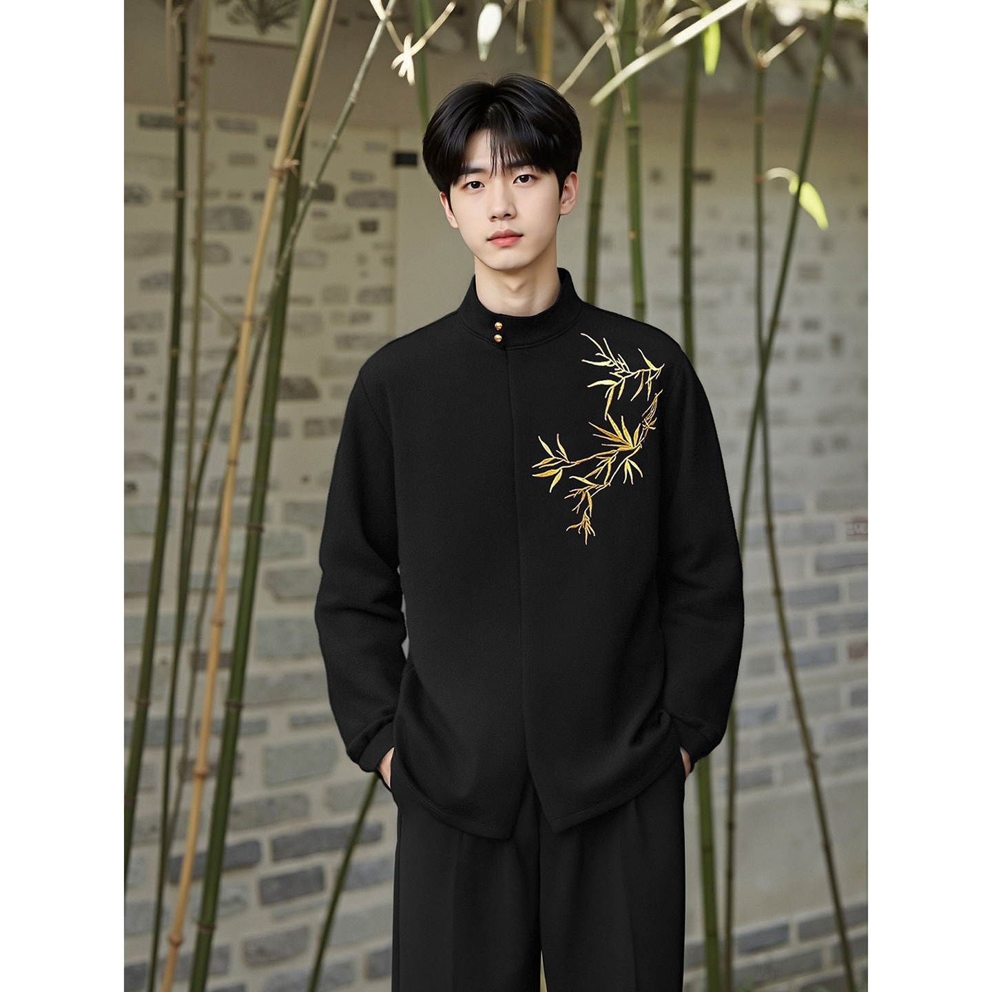 衬衫 订婚衣服黑色金竹刺绣长袖 国风设计感订婚领证衬衣 男士 新中式