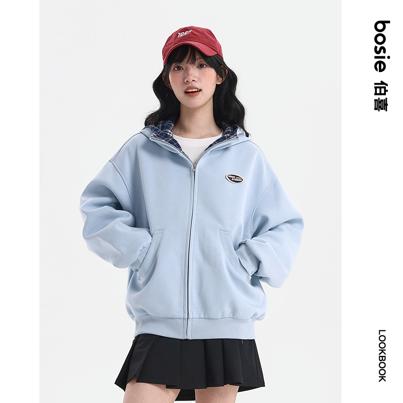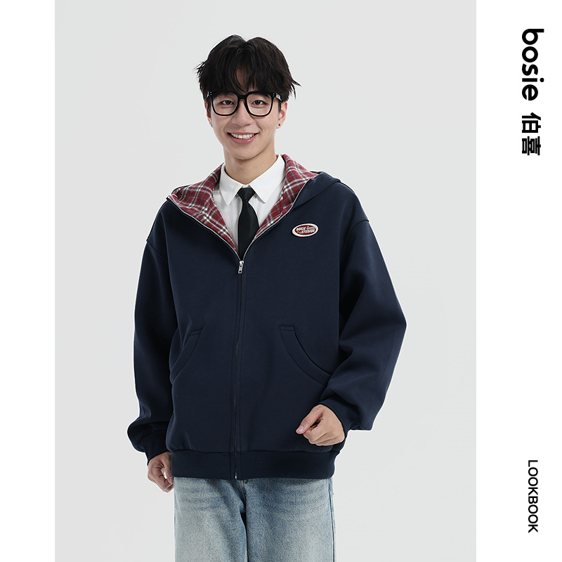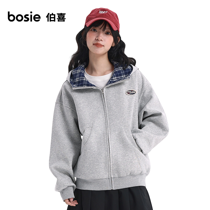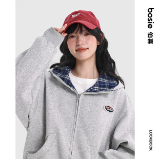休闲宽松百搭潮 开襟卫衣男情侣撞色帽衫 bosie伯喜2025年秋季 新款