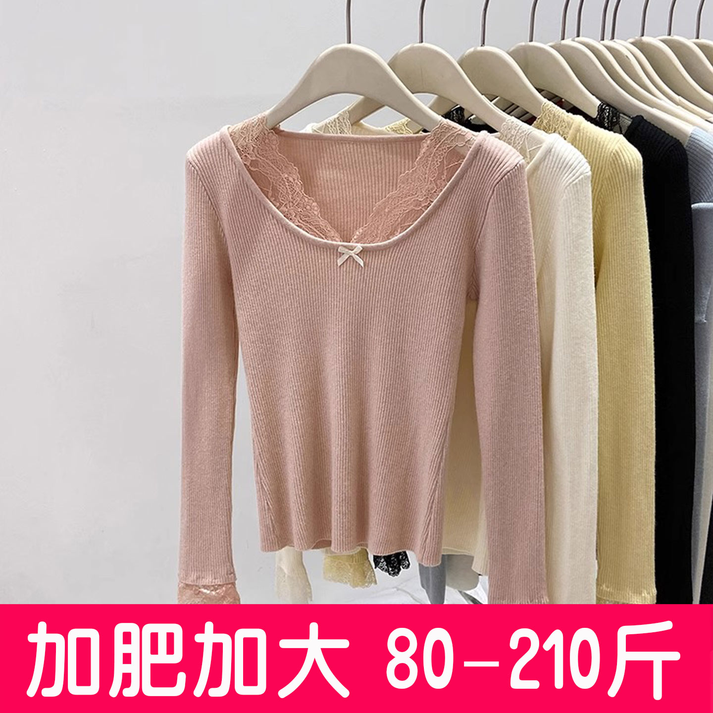 长袖 纯欲风内搭毛衣打底衫 上衣女胖mm秋冬 蕾丝拼接V领针织衫 大码