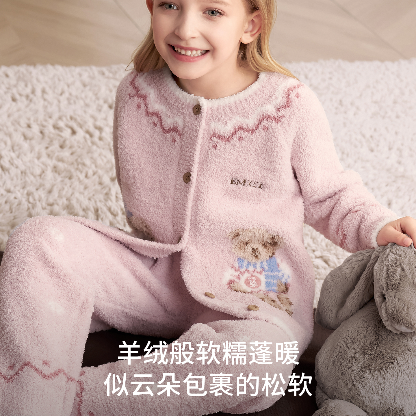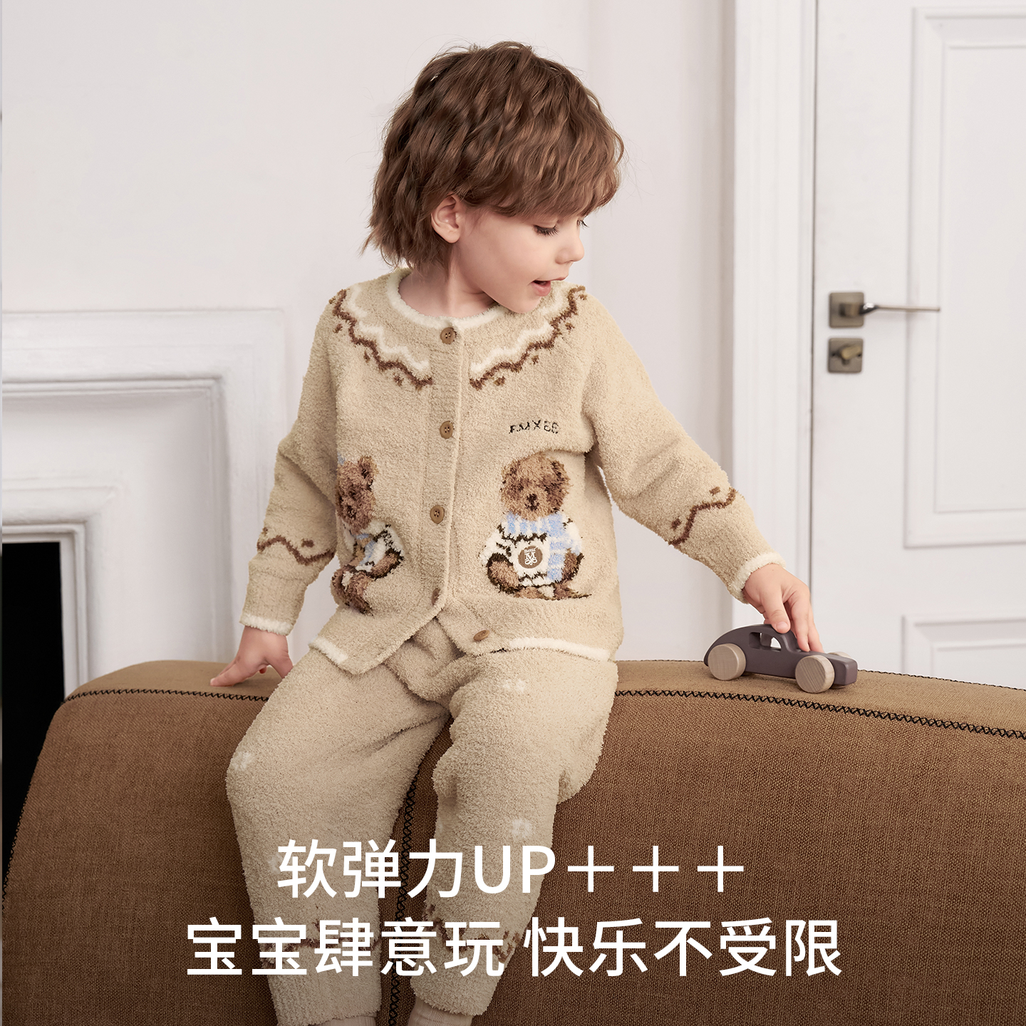 嫚熙儿童家居服可可熊半边绒套装 秋冬 宝宝加厚加绒保暖睡衣套装