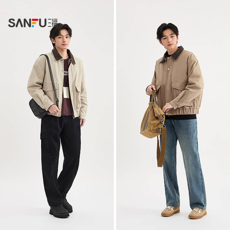 大口袋外套 三福2025冬季 PU双层翻领短棉衣 户外工装 510786 男士