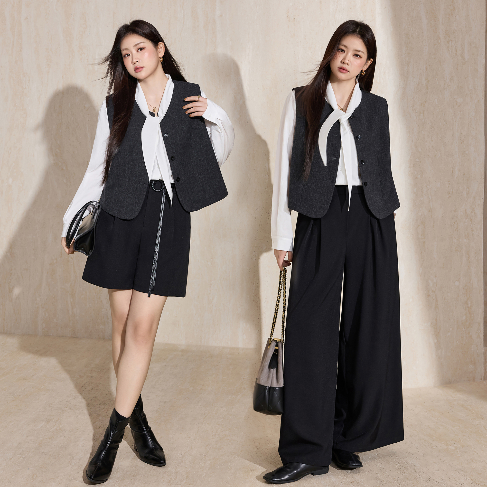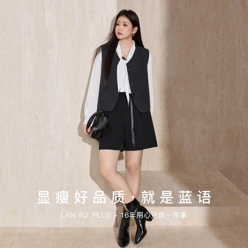 V领设计飘带衬衫 白色法式 休闲气质无袖 西装 蓝语大码 马甲套装 女装
