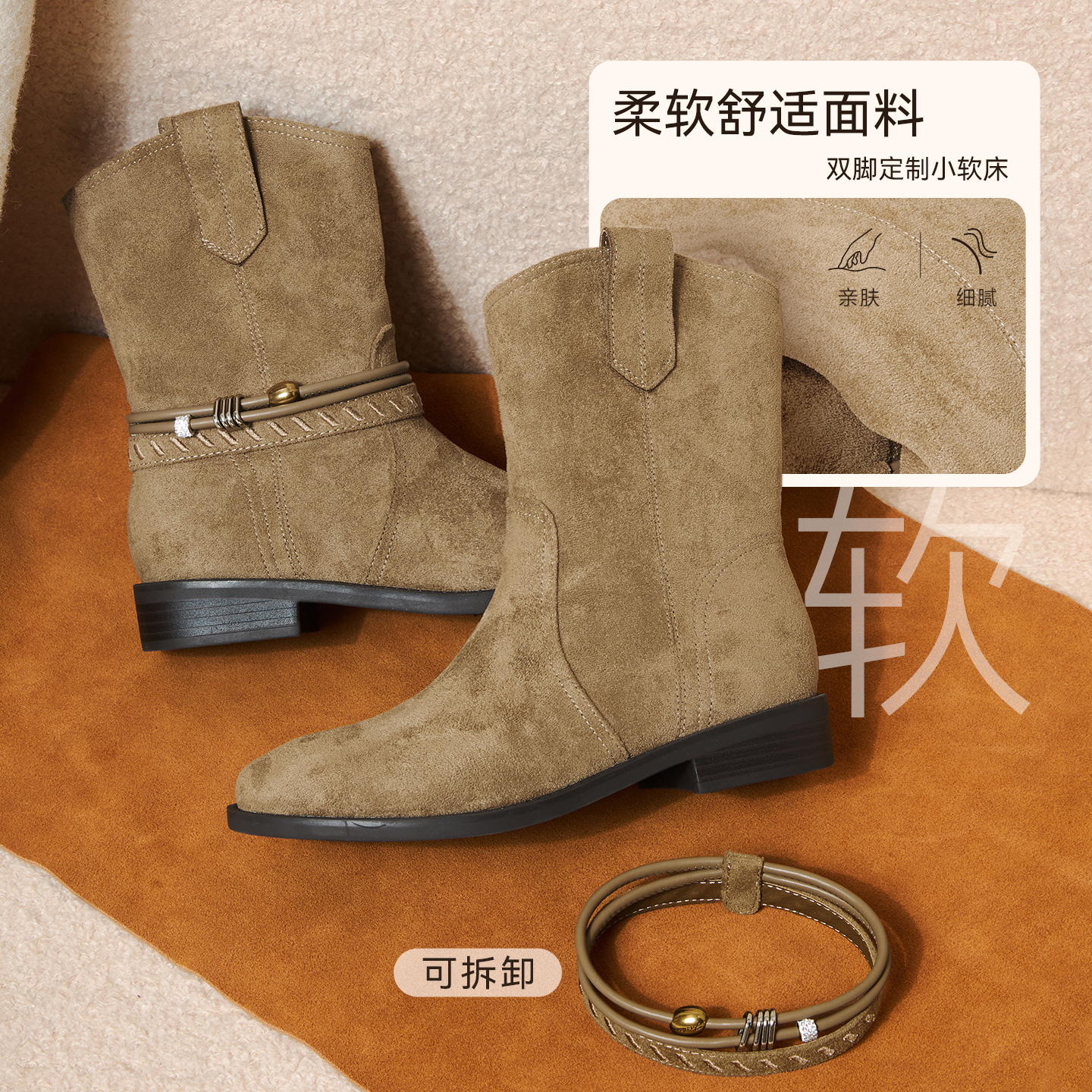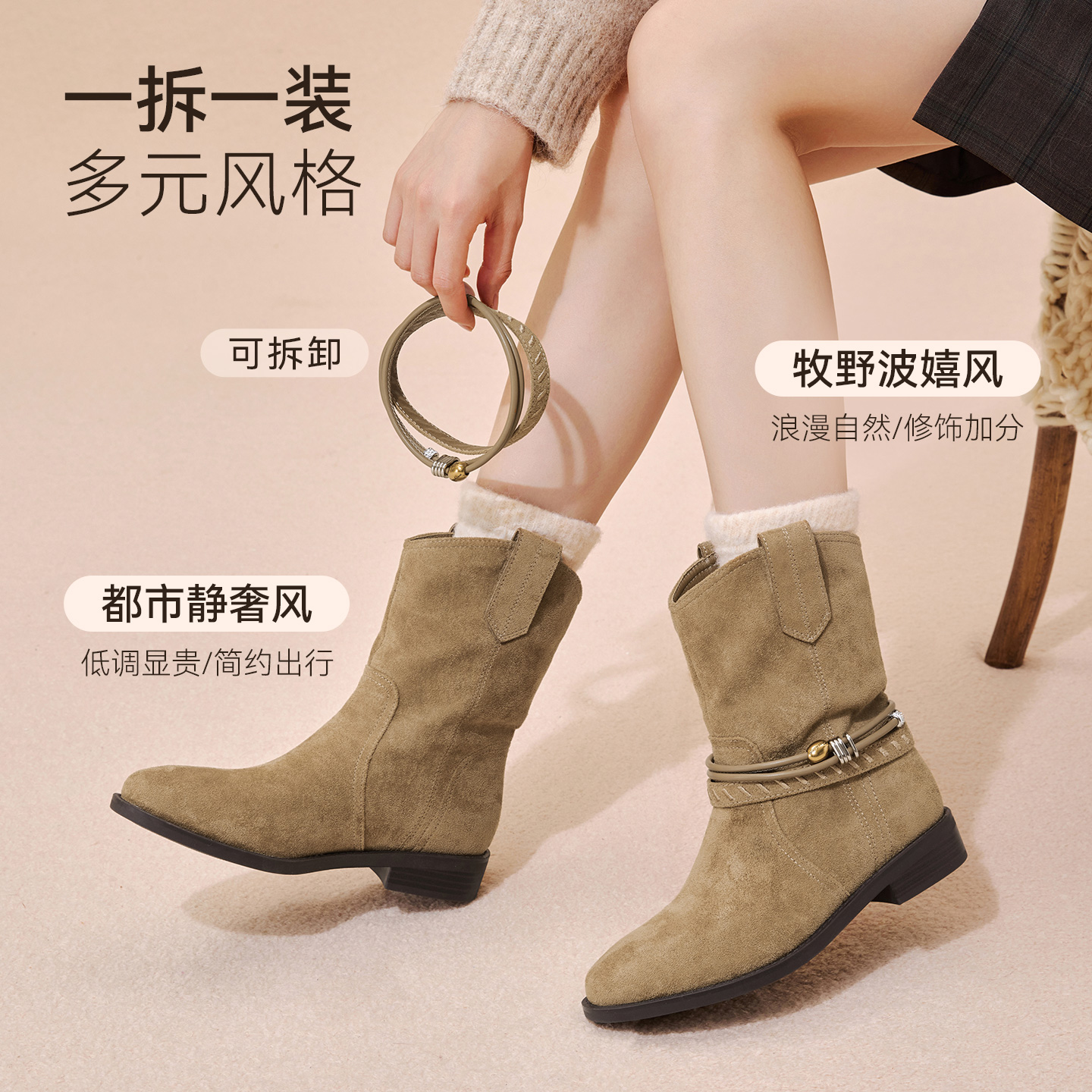 美拉德西部牛仔堆堆短靴女 百思图西部旅人25冬新款 张碧晨同款