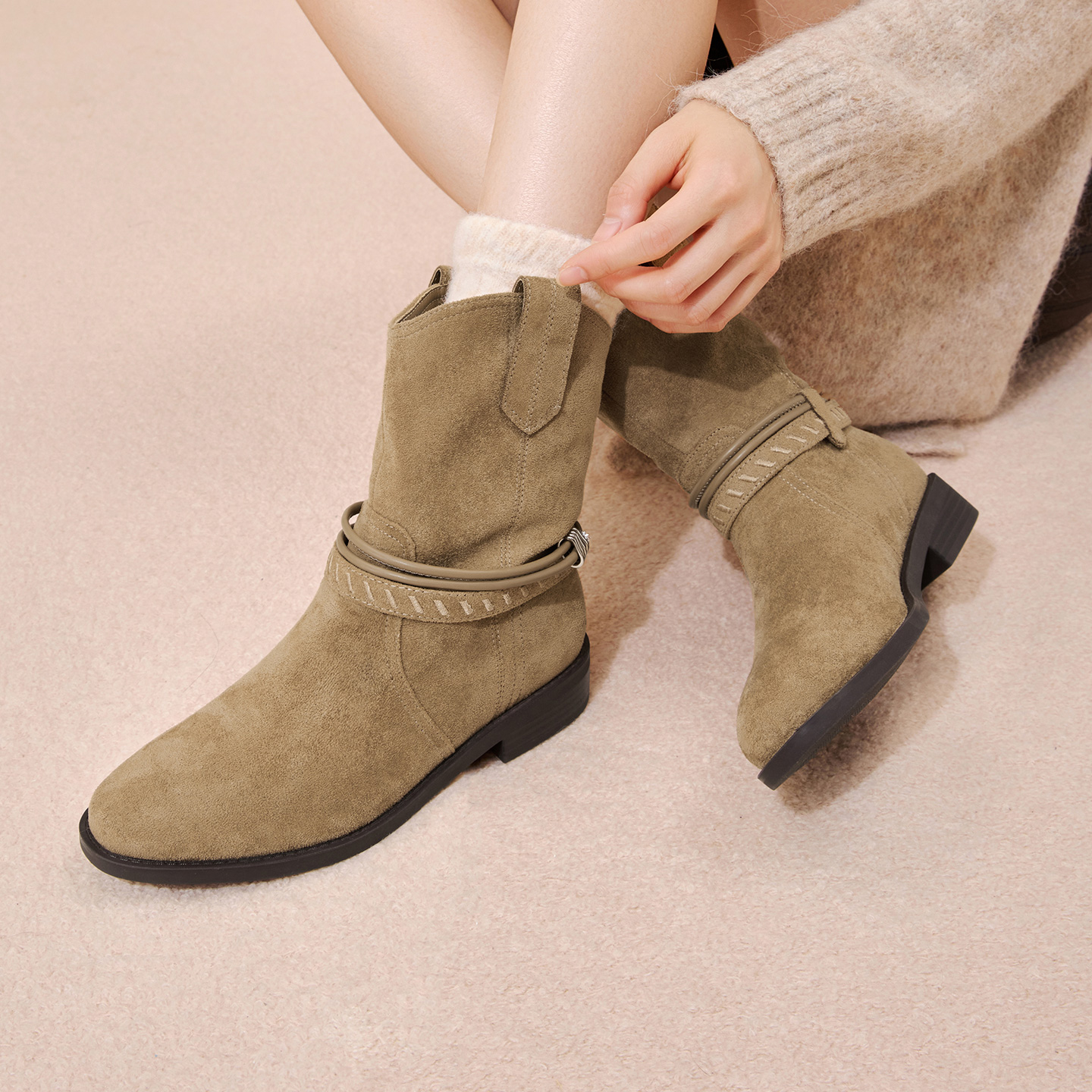 靴2025新款 天美意巴恩风复古黄金V西部靴堆堆靴短靴女鞋 软底时装