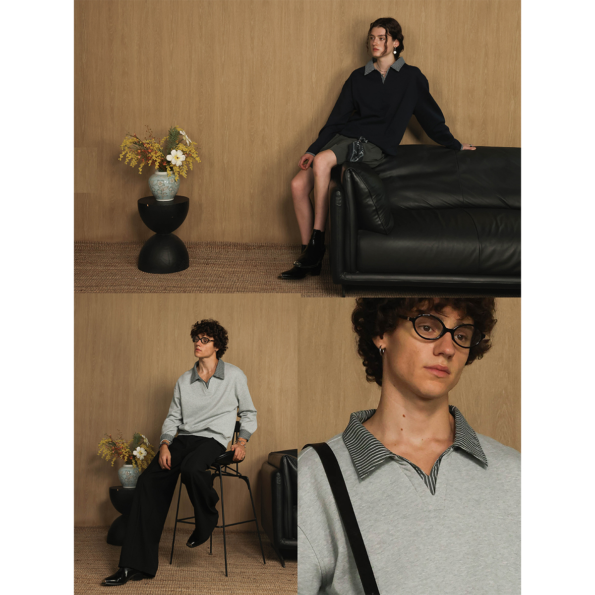 轻休闲自发热条纹衬衫 领假两件V领抓绒卫衣 自发热