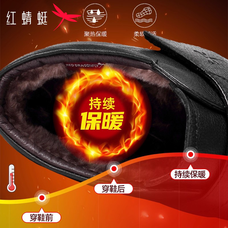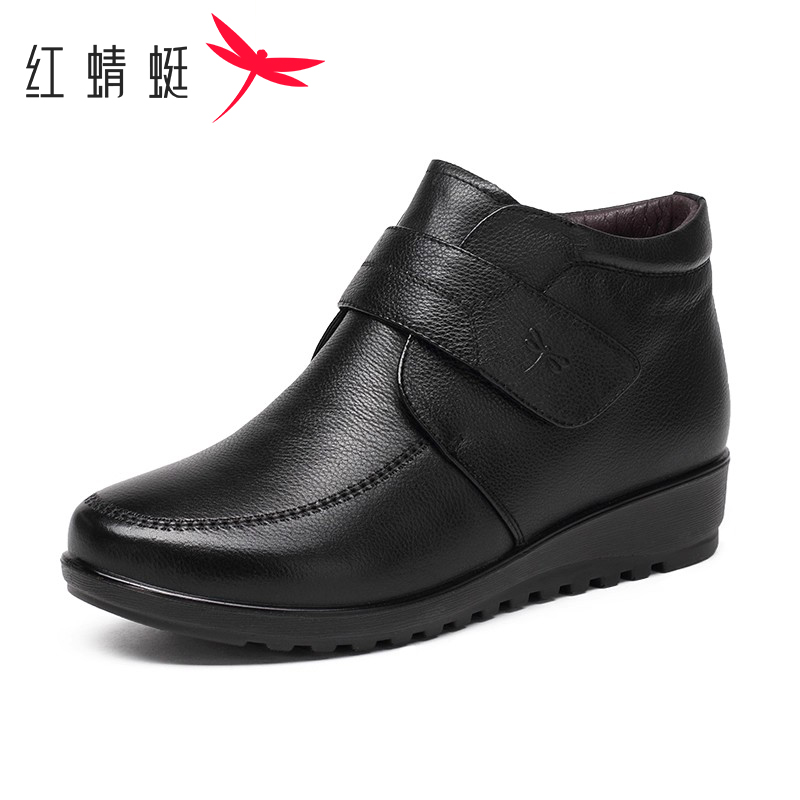 红蜻蜓真皮短靴女冬季 加绒短筒棉靴魔术贴坡跟中老年妈妈保暖棉鞋