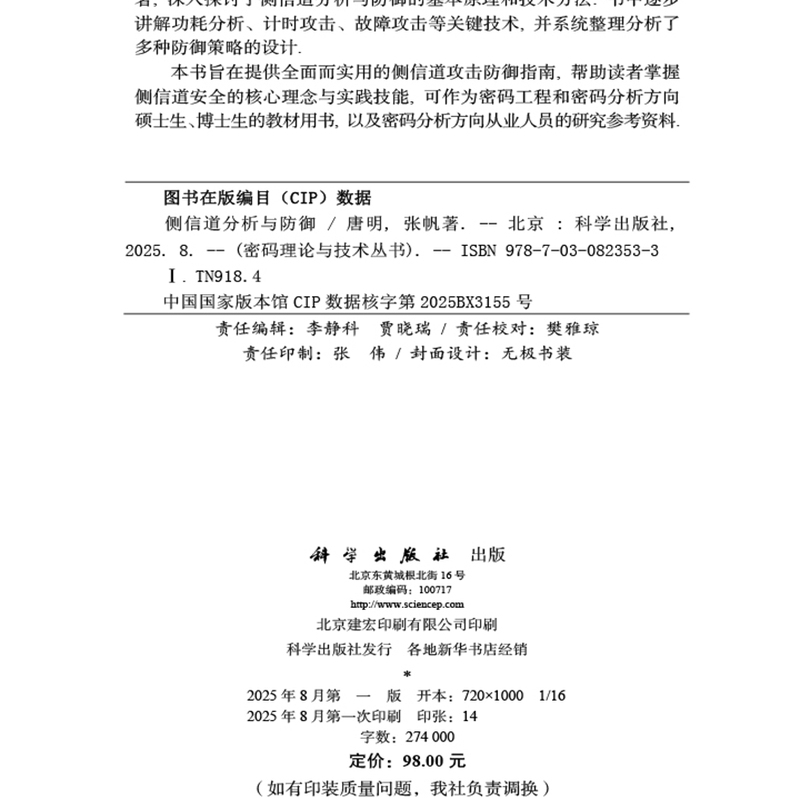 张帆 著 科学出版 侧信道分析与防御 社9787030823533 帮助读者理解 唐明 侧信道攻击防御指南 现货速发 本书旨在提供全面而实用