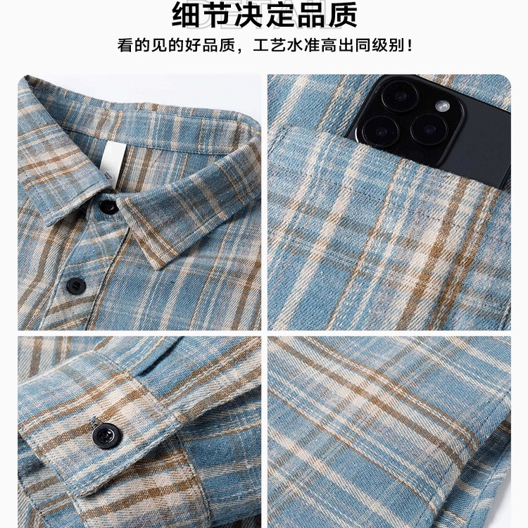 高级感痞帅长袖 美式 新款 外套男生秋季 宽松百搭情侣外套 蓝色格衬衫