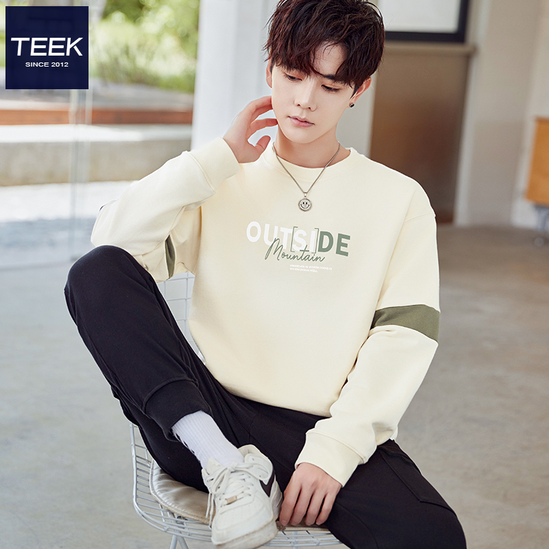 TEEK青少年纯棉拼色卫衣男2025秋季 T恤宽松复古上衣服 高品质长袖