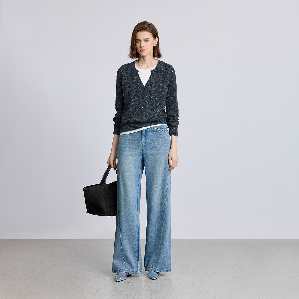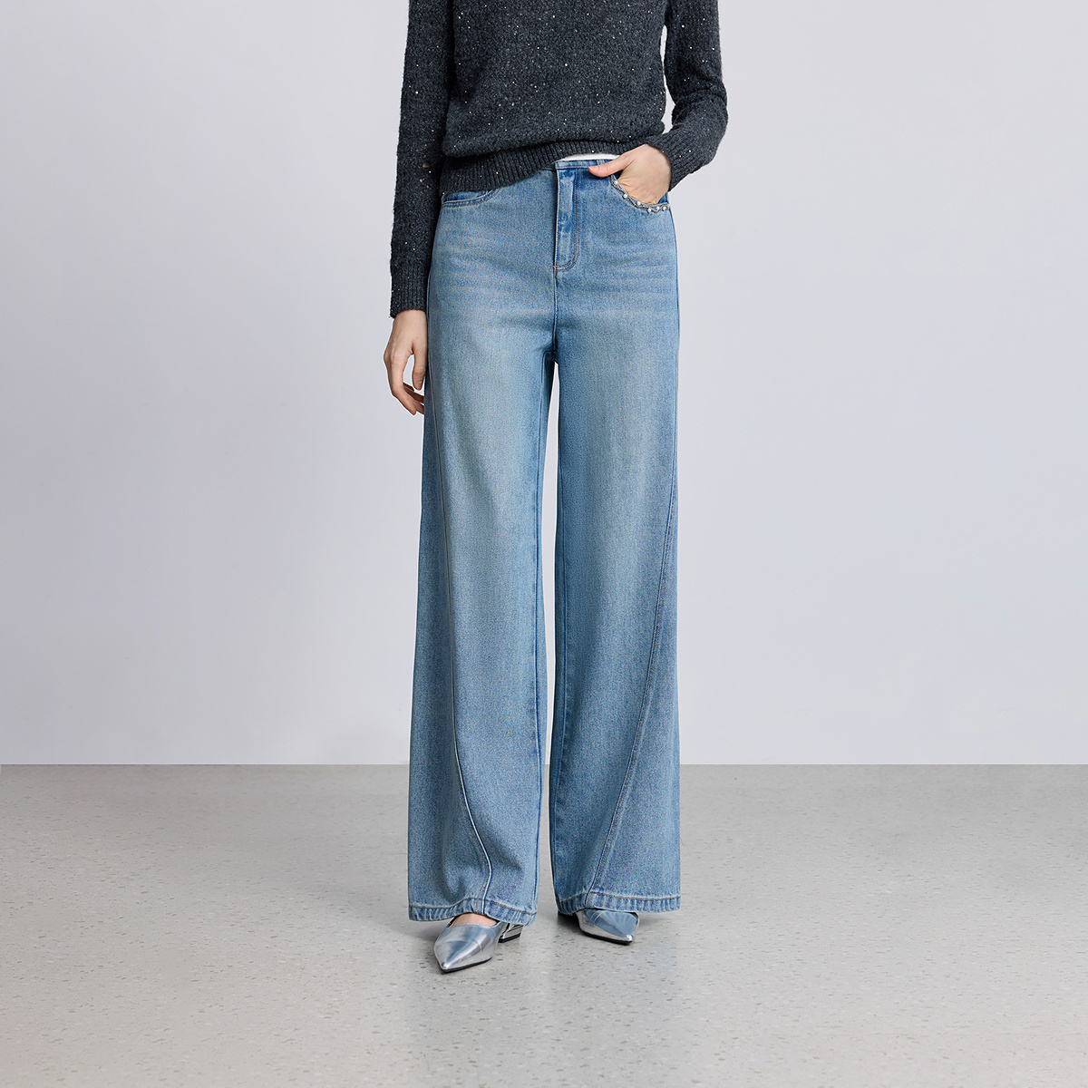 女 牛仔裤 LILY2025冬新款 莱赛尔棉重工钉珠复古休闲通勤直筒阔腿裤