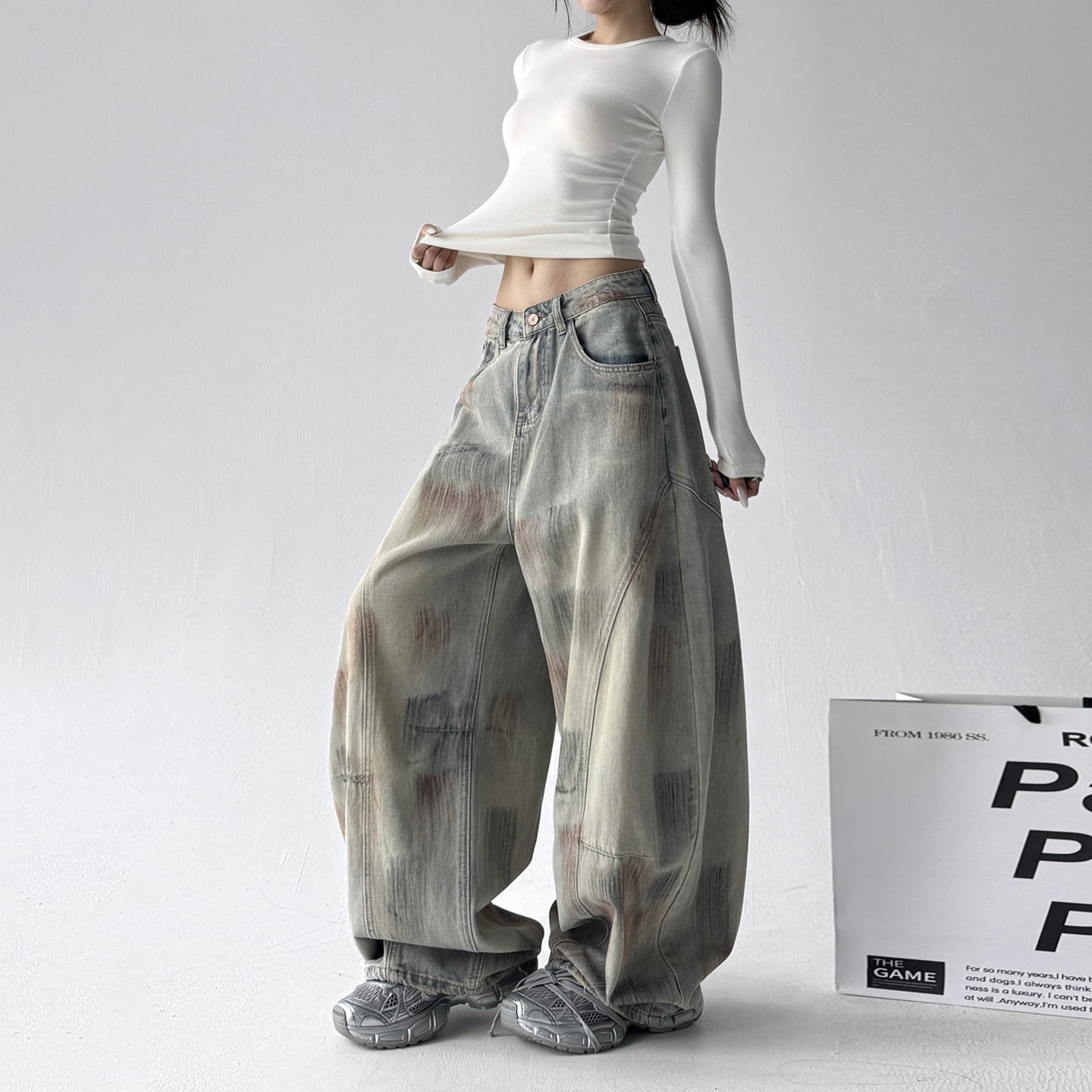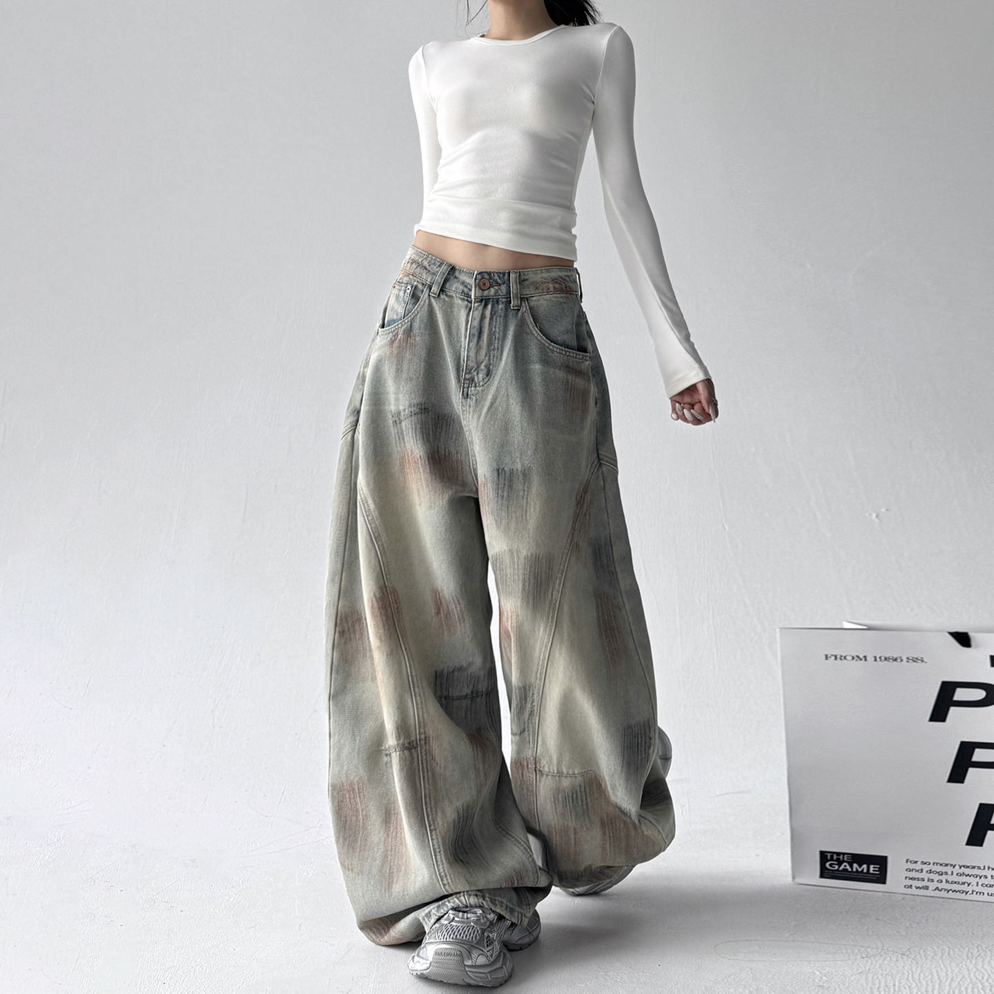 女宽松涂鸦阔腿直筒长裤 2025秋季 百搭设计感牛仔裤 时尚 子 新款