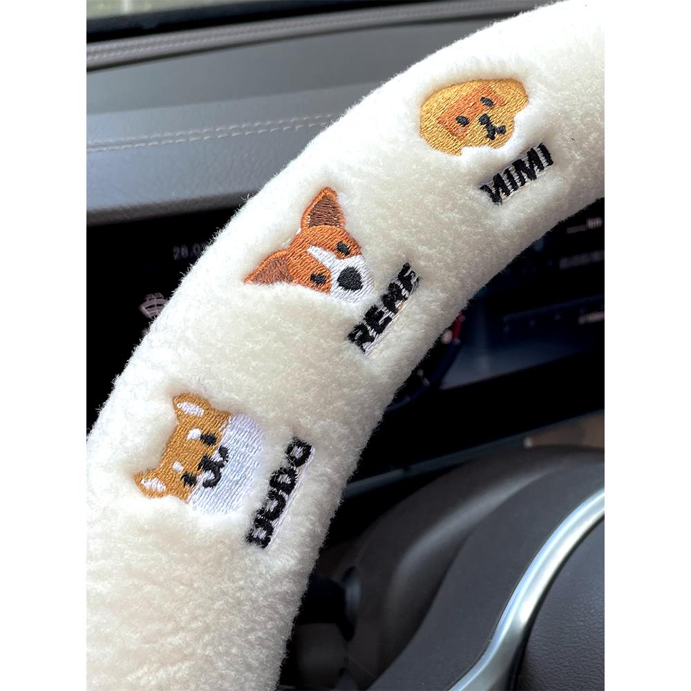 羊绒汽车方向盘套冬季 短毛绒保暖简约刺绣可爱保护套男女通用把套