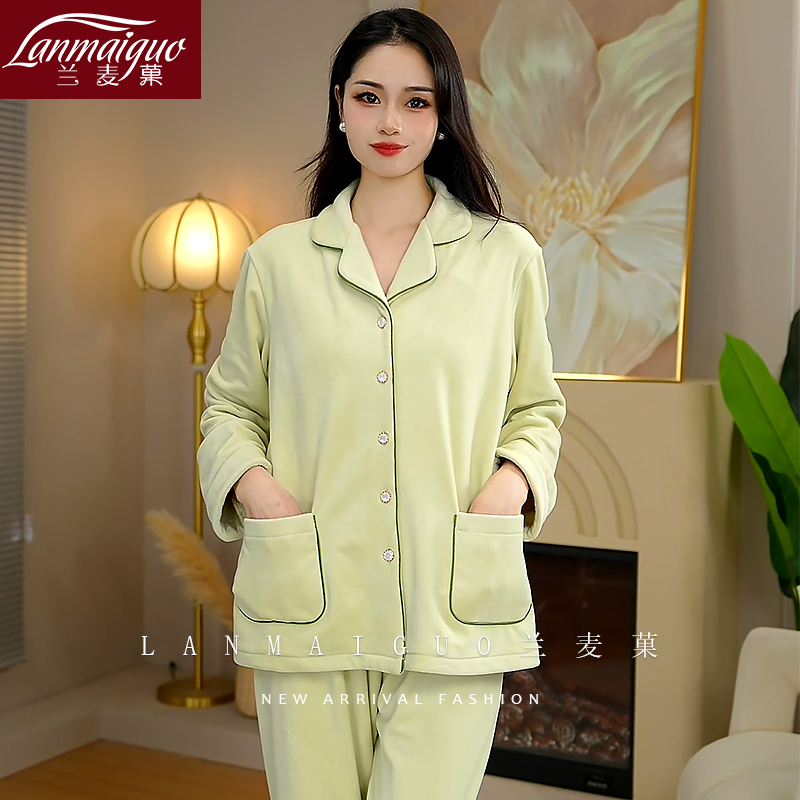 加大码 套装 家居服春秋 秋冬季 芬腾女士睡衣空气棉夹层纯棉加厚长袖