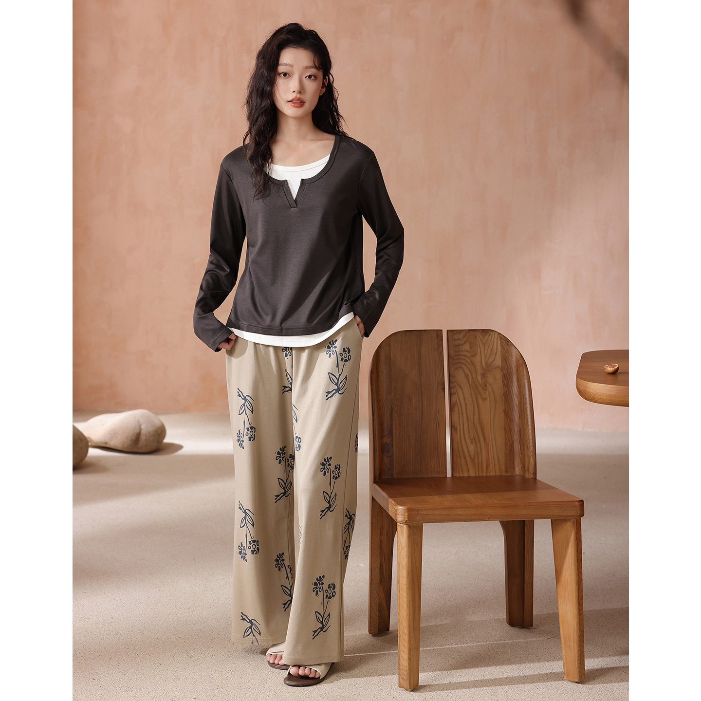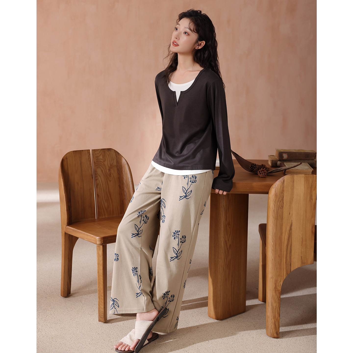 休闲可外穿出门家居服套装 华小彩带胸垫睡衣女春秋季 秋冬纯棉长袖