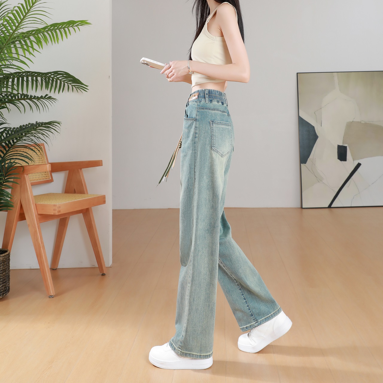 女2025秋季 百家好高腰牛仔裤 新款 印花垂感直筒裤 Basic 长裤 House