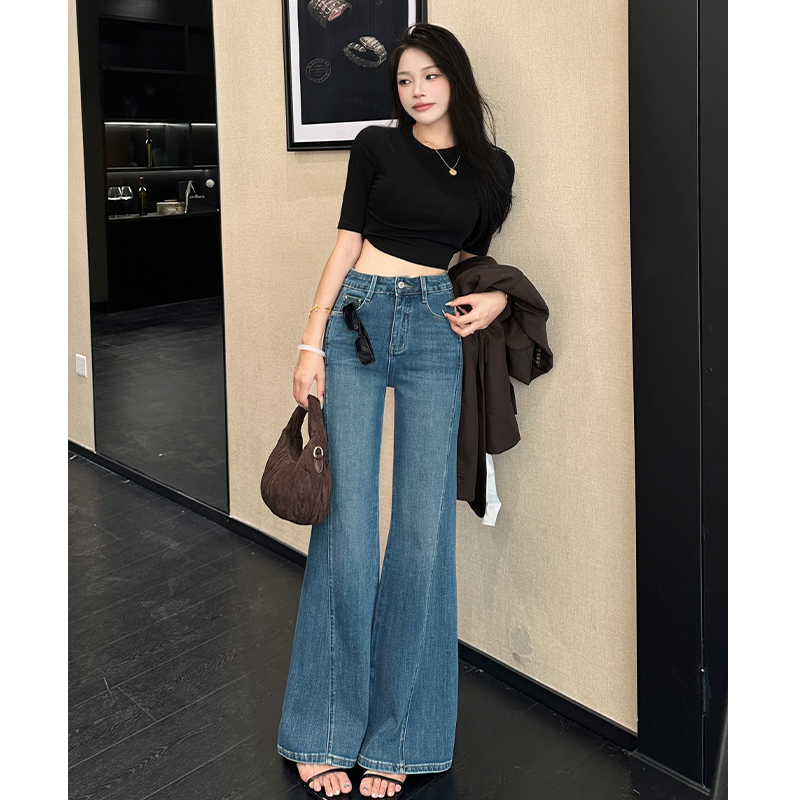 高腰显瘦宽松喇叭裤 女秋冬爆款 加绒微喇牛仔裤 乔栈蓝色设计感时尚