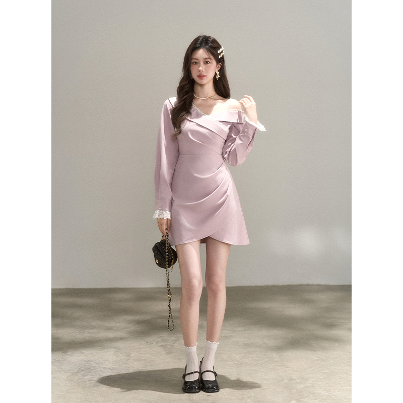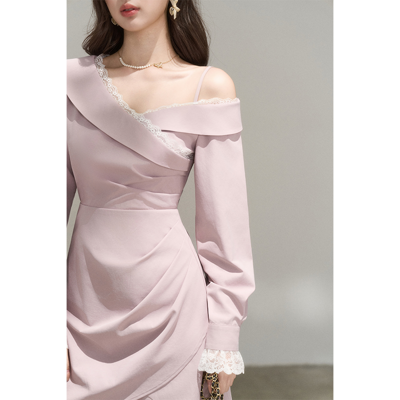 a字裙 温柔风褶皱掐腰漂亮法式 拼接蕾丝紫色斜肩长袖 连衣裙女秋季