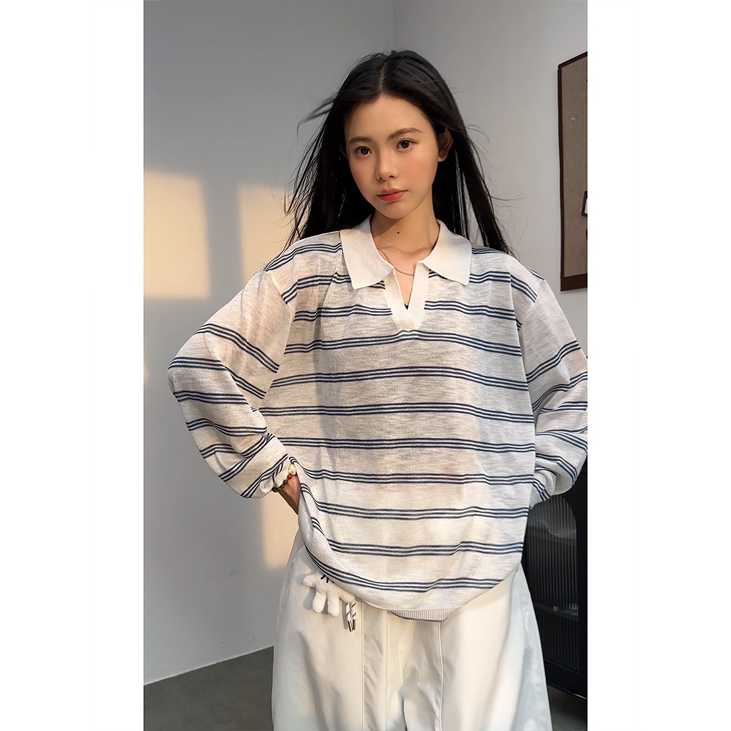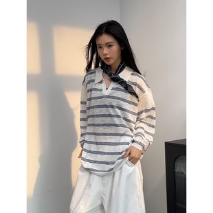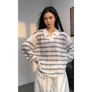 轻薄透气防晒罩衫 蓝白条纹polo衫 秋季 t恤男女款 内搭针织上衣 长袖
