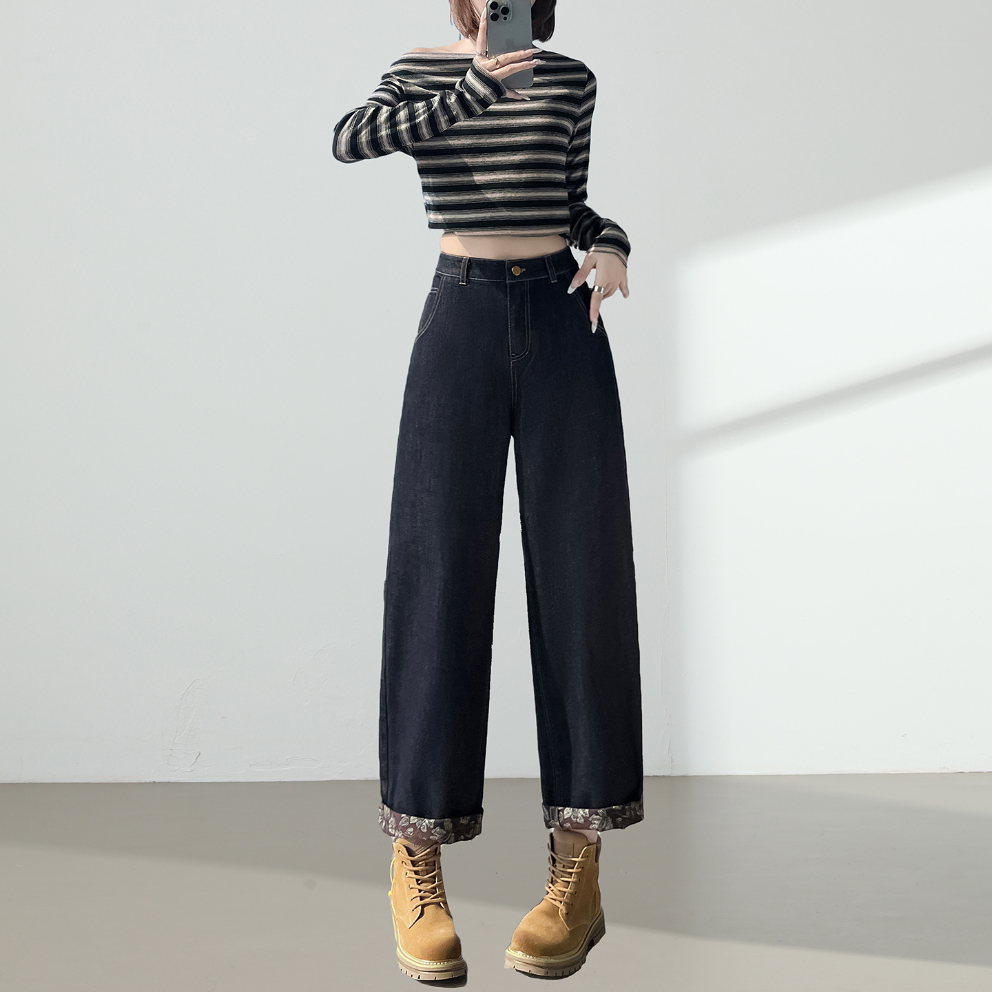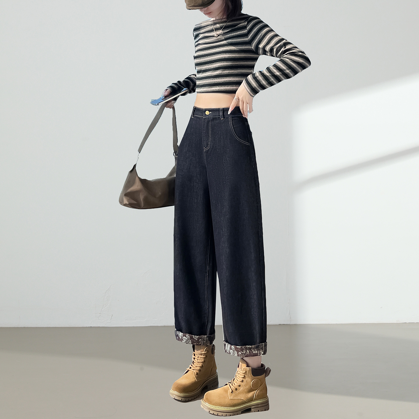 直筒拖地裤 高腰垂感宽松显瘦窄版 子 女秋冬新款 黑色加绒阔腿牛仔裤