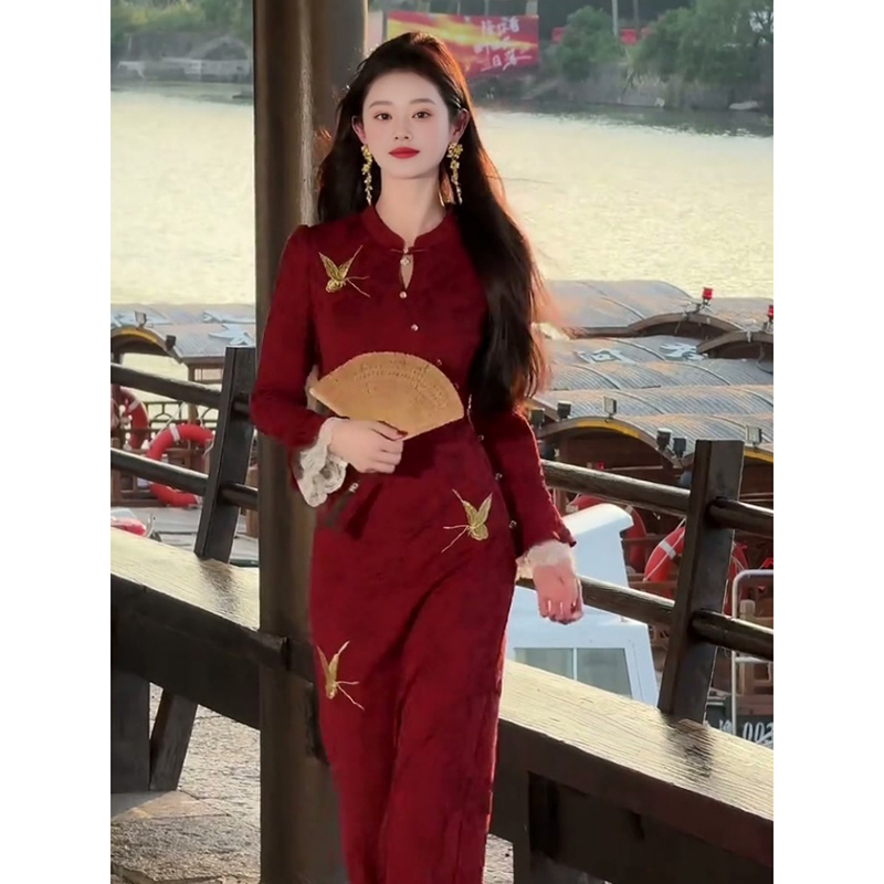 红色连衣裙 订婚礼服重要场合漂亮宴会国风长袖 新中式 旗袍2025新款