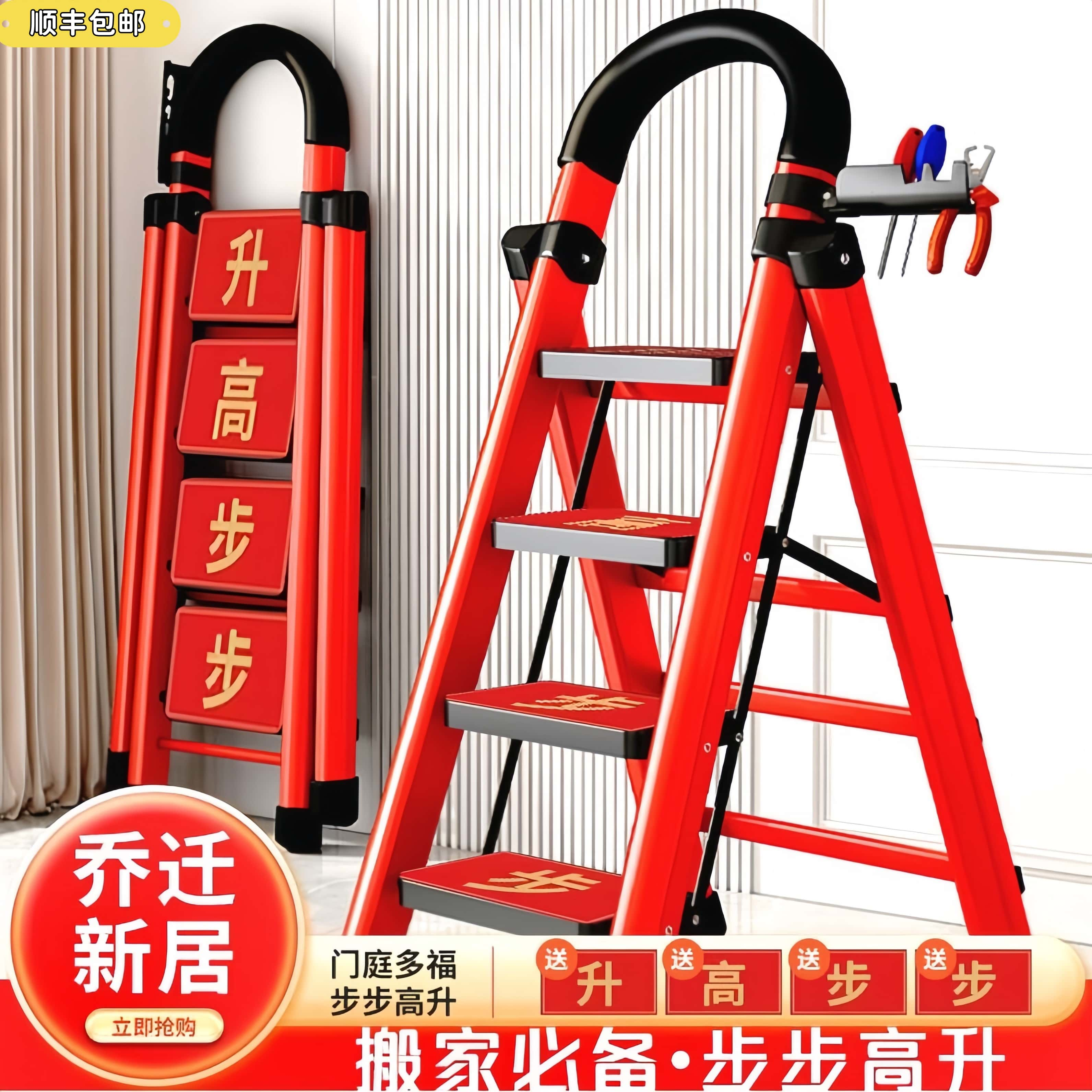 日本乔迁之喜红梯子家用加厚折叠伸缩梯凳三四六步人字梯搬家礼物